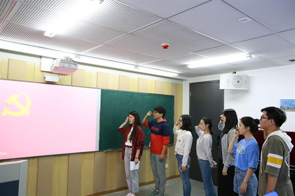 最后,全體黨員面對黨旗重溫入黨誓詞。