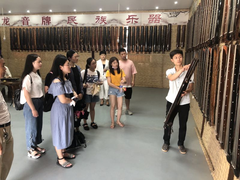 師生們一走進(jìn)展廳,就被琳瑯滿(mǎn)目的樂(lè)器所吸引,古箏、琵琶、二胡、柳琴等各類(lèi)樂(lè)器,制作精良,讓人眼花繚亂。師生們?cè)趶S(chǎng)長(zhǎng)的引導(dǎo)下來(lái)到古箏生產(chǎn)車(chē)間,車(chē)間的師傅們都在有條不紊的忙碌著。從面板選擇、風(fēng)干壓片,到挖嵌定型、著漆上色、安裝調(diào)試,一道道繁雜的工序都是由手工完成,每一個(gè)細(xì)節(jié)都決定了產(chǎn)品的質(zhì)量。在古琴生產(chǎn)車(chē)間里,同學(xué)們了解到從原木到成品一共要經(jīng)過(guò)200多道工序,每一項(xiàng)都須經(jīng)手工反復(fù)打磨,看到師傅們一絲不茍的工作態(tài)度和精湛嫻熟的制作技藝,仿佛在雕琢一件件藝術(shù)品,同學(xué)們的欽佩之情油然而生。