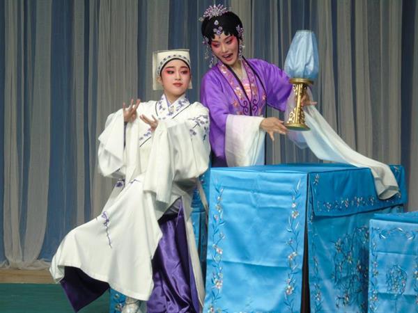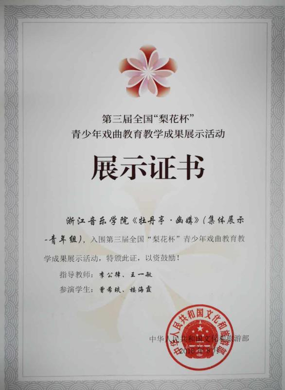 8月20日至24日,由文化和旅游部主辦,文化和旅游部文化科技司、中國戲曲學(xué)院承辦的第三屆全國“梨花杯”青少年戲曲教育教學(xué)成果展示活動在北京舉行。由我院戲劇系教師李公律、王一敏指導(dǎo)的2017級越劇演員班曾希琰、樓海霞等同學(xué)共同演出的越劇折子戲《牡丹亭·幽媾》入選本次戲曲教學(xué)成果展示活動。
