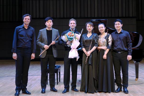 下半場,共有長笛獨(dú)奏、三重奏和四重奏等6首室內(nèi)樂作品。第一首由赫斯金攜我院長笛教師何靖、鋼琴教師朱冰冰共同帶來弗瑞德里?!靹诘慕?jīng)典曲目《G大調(diào)長笛與三重奏》。兩支長笛吹奏出明亮的樂音與鋼琴輕柔對答,圍繞中心旋律相互訴說,如似閨中密友?!峨y忘的記憶》采用日本曲調(diào),營造出一種具有東方異國情調(diào)的神秘氛圍。兩部作品深刻表現(xiàn)我院深化“走出去”、夯實(shí)“請進(jìn)來”的理念,使中外音樂交流日益密切。赫斯金還以清澈、順暢的輕柔音色與鋼琴展開了親密的對話,《克利夫蘭時(shí)光》的演奏令人心馳神往。