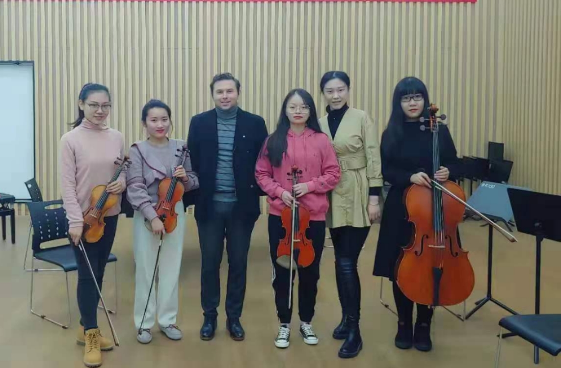 在單簧管、低音提琴和鋼琴三重奏演奏的博泰西尼《A調(diào)單簧管、低音提琴和鋼琴》三重奏后,Namirovsky教授對(duì)三重奏里每個(gè)人的音樂角色進(jìn)行了更好的定位,并指出室內(nèi)樂中演奏時(shí)要注意聲部間的音樂交流。最后,弦樂四重奏演奏海頓《d小調(diào)第七十六弦樂四重奏》,Namirovsky教授提出要對(duì)音樂有嚴(yán)謹(jǐn)、細(xì)膩的態(tài)度,強(qiáng)調(diào)要注重曲子的色彩變化和。同學(xué)們?cè)谡n堂上與老師進(jìn)行了緊密的互動(dòng),并運(yùn)用多種生動(dòng)形象的例子和深情表演示范來描述該如何表達(dá)曲中的感情。