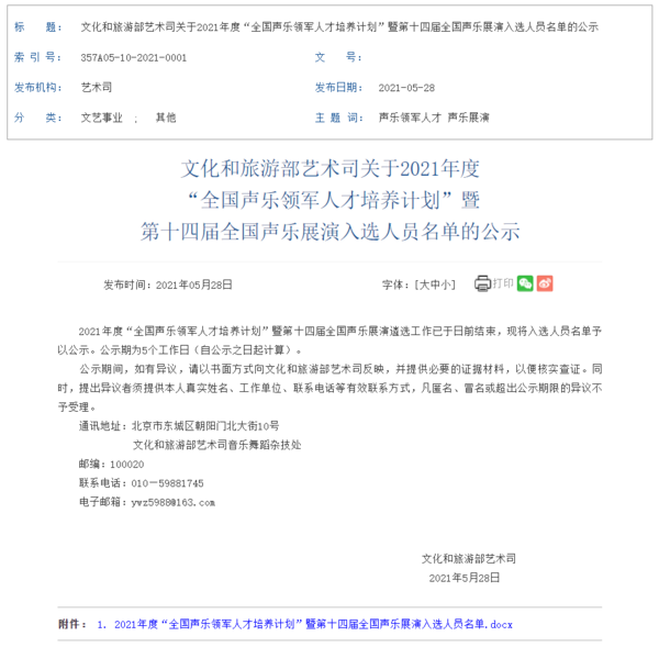 為發(fā)現(xiàn)和培養(yǎng)優(yōu)秀聲樂藝術(shù)人才,促進(jìn)我國音樂事業(yè)繁榮發(fā)展,文化和旅游部從2021年起,結(jié)合舉辦全國聲樂展演,實(shí)施“全國聲樂領(lǐng)軍人才培養(yǎng)計(jì)劃”,并分美聲、民族、流行音樂三個(gè)類別,面向全國開展遴選工作。此次入選人員名單中,浙江省共有3人入選,位居全國各省份的前列。據(jù)悉,入選的優(yōu)秀聲樂人才作為2021年度“全國聲樂領(lǐng)軍人才培養(yǎng)計(jì)劃”的培養(yǎng)對(duì)象,將直接參加8月份在哈爾濱舉辦的第十四屆全國聲樂展演。