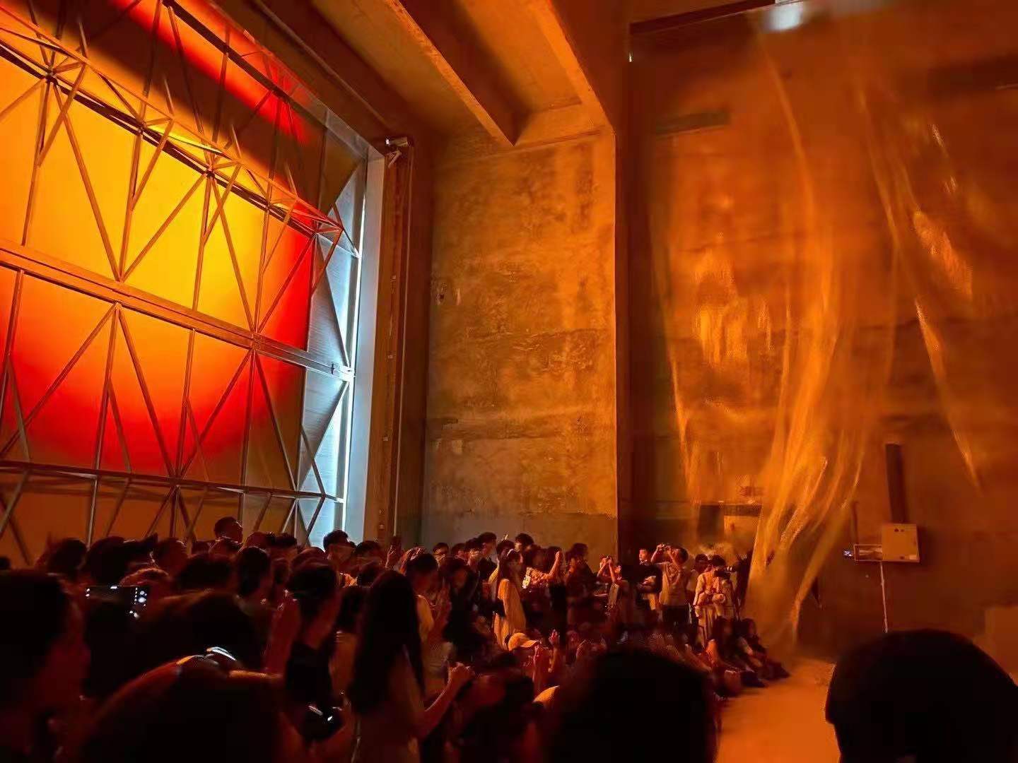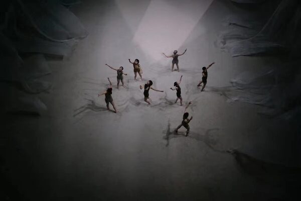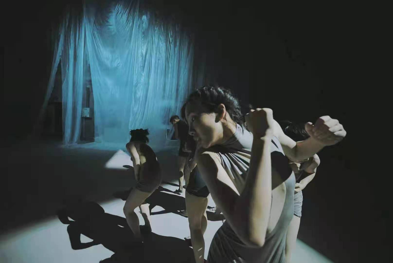 空間裝置&環(huán)境舞蹈作品《春江花月夜》共分為兩種形式,其一為視覺空間的常態(tài)展示,融合了溫感繪畫、薄膜裝置、風控與聲控裝置、多媒體等視覺藝術媒介;其二為空間裝置與環(huán)境舞蹈相結合的現(xiàn)場展演,空間中多元素裝置的介入與舞者的即興性肢體相互呼應與碰撞,結合舞者肢體的內在張力、情緒能量,通過光效變化,構建出內與外、動與靜、身體本體與物質媒介間的對話關系,最終以一種充滿當代性的探索視角,將詩人張若虛的盛唐孤篇《春江花月夜》中的美學意味與宇宙意識,和當下的“自我”形成聯(lián)動,在極繁的空間形式變化中,抽離出極簡的情感表達。