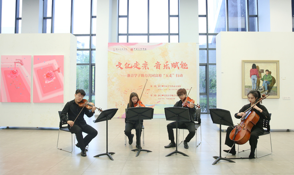 10月13日,由浙江音樂學院學生工作部和中國美術(shù)學院學生工作部聯(lián)合舉辦的學生交流實踐項目“文化走親 音樂賦能”系列活動啟動儀式暨浙音、美院作品交流展成功舉辦。學院黨委副書記王均寅,黨委委員、宣傳部部長、教師工作部部長李俊出席了活動。啟動儀式在薩克斯重奏《Bounce》《Hot Lettuce》和小提琴四重奏《瑤族舞曲》《一步之遙》中拉開帷幕。