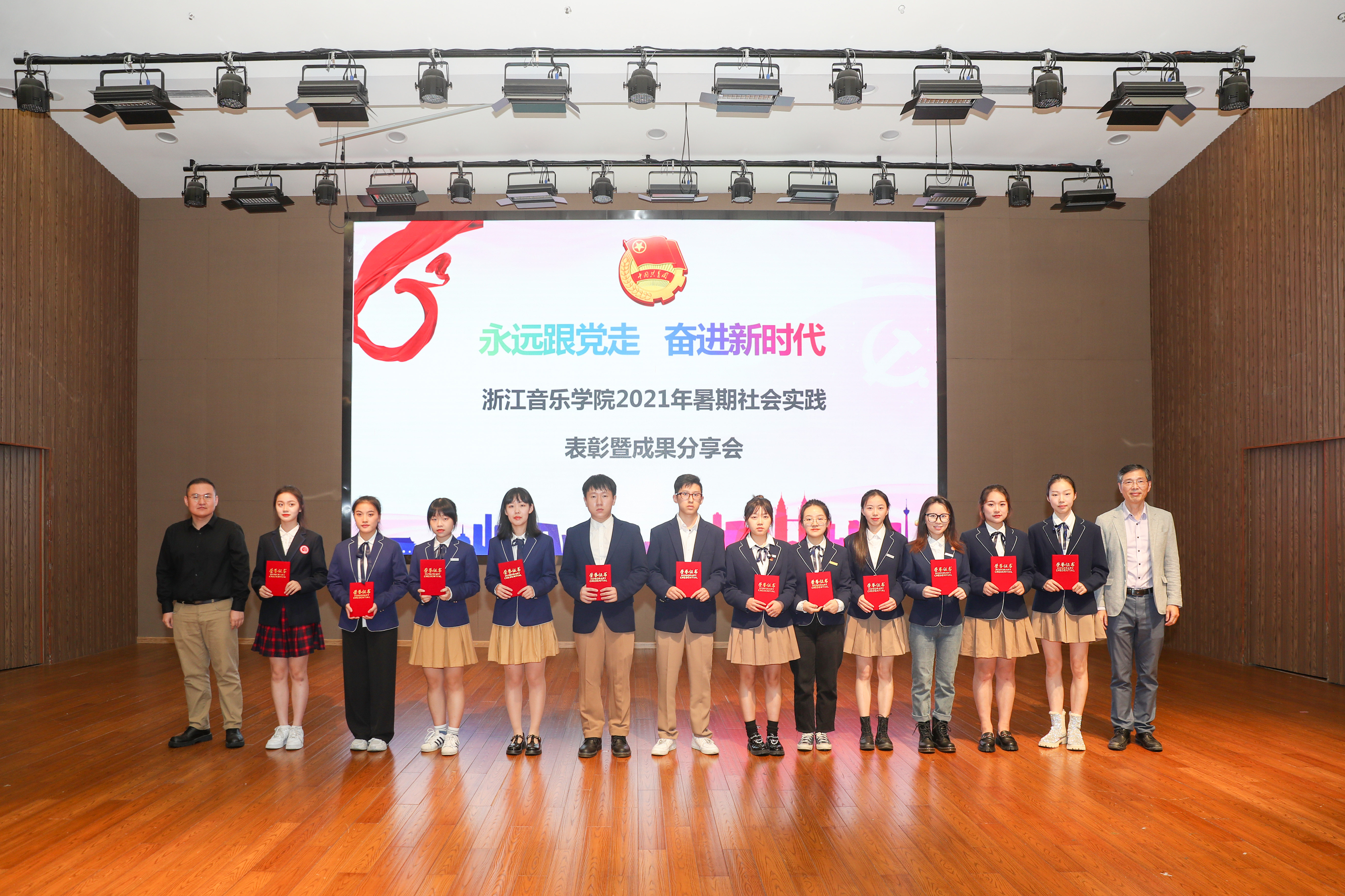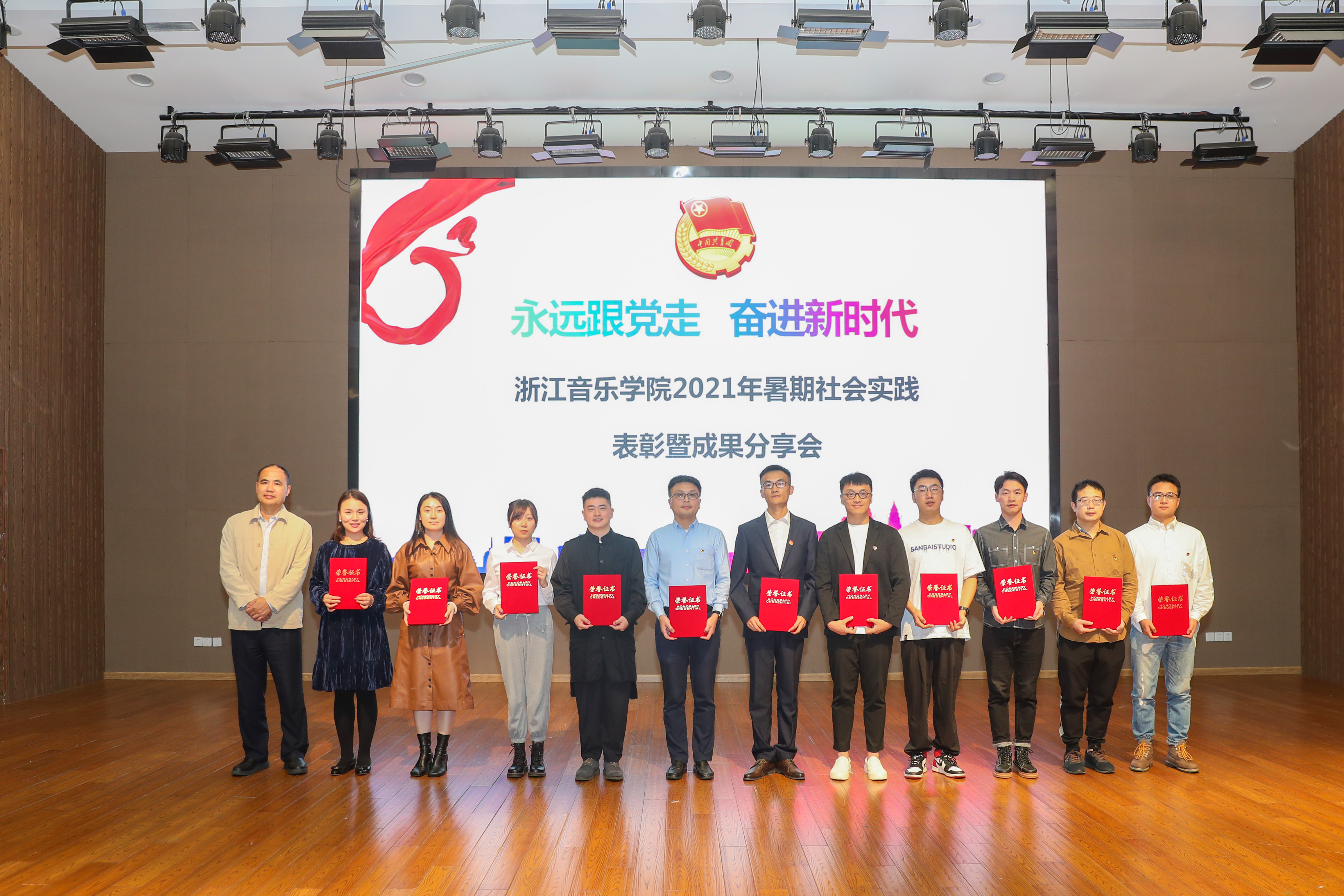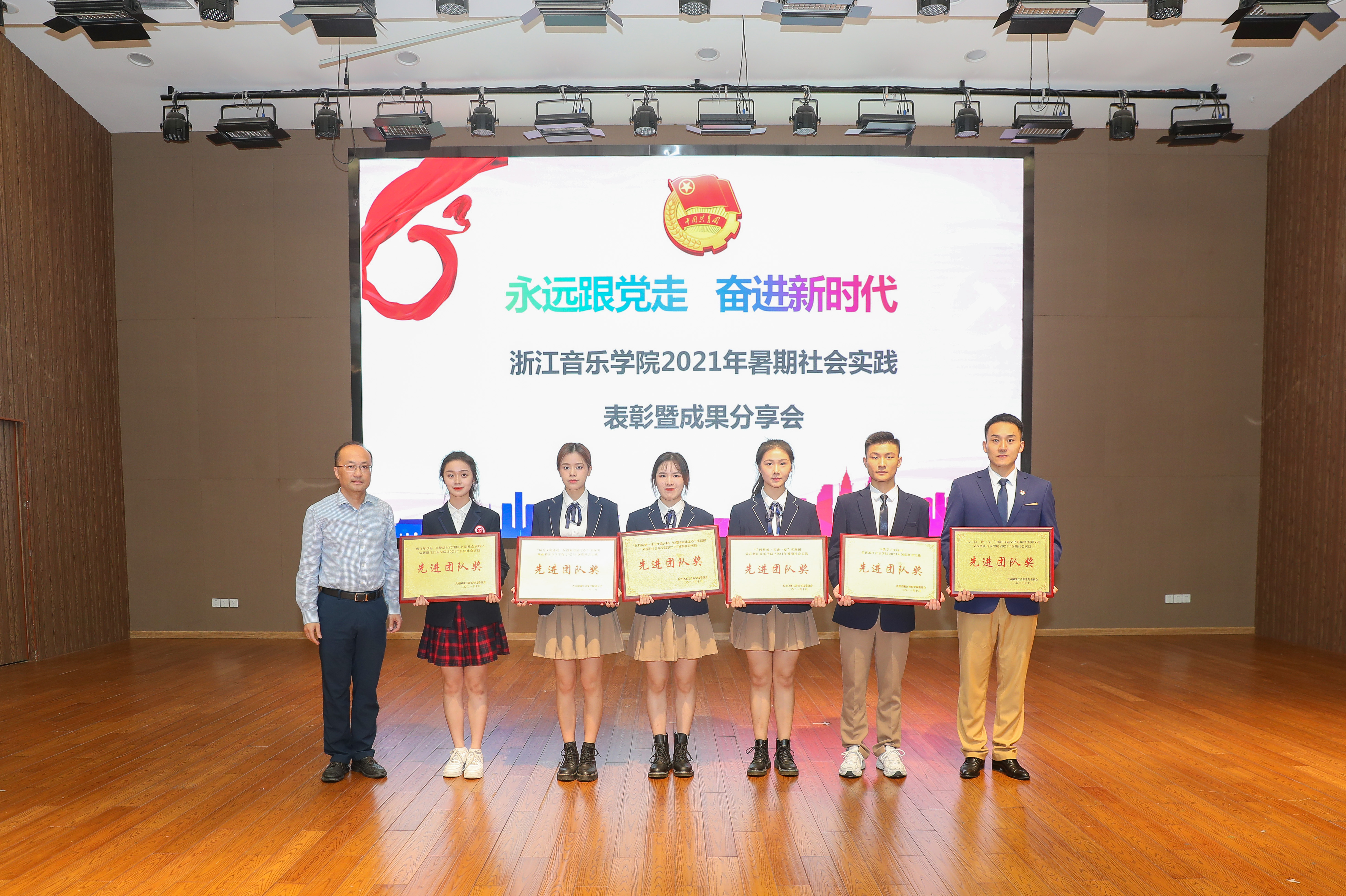 會(huì)上表彰了本年度暑期社會(huì)實(shí)踐先進(jìn)集體和個(gè)人。“奇詩(shī)妙音”浙江詩(shī)路文化采風(fēng)創(chuàng)作實(shí)踐團(tuán)等6支團(tuán)隊(duì)榮獲“社會(huì)實(shí)踐先進(jìn)團(tuán)隊(duì)”榮譽(yù)稱號(hào);張亞鑫等11名教師榮獲“社會(huì)實(shí)踐優(yōu)秀指導(dǎo)教師”榮譽(yù)稱號(hào);汪倪宸等72名同學(xué)榮獲“社會(huì)實(shí)踐先進(jìn)個(gè)人”榮譽(yù)稱號(hào)。先進(jìn)團(tuán)隊(duì)代表分別從“追憶紅色黨史”“助力鄉(xiāng)村振興”“慶祝建黨百年”等方面進(jìn)行了實(shí)踐成果展示,將原創(chuàng)音樂舞蹈、詩(shī)朗誦、紅歌演唱等元素搬上舞臺(tái),重現(xiàn)實(shí)踐場(chǎng)景,鮮活的表現(xiàn)形式讓現(xiàn)場(chǎng)師生近距離感受實(shí)踐氛圍、領(lǐng)悟?qū)嵺`精神。