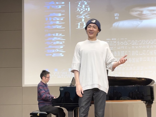 11月19日,張毅、金圣權(quán)做了“如何‘身臨其境’地表演與歌唱”的講座和工作坊。他們講述了各自的求學(xué)經(jīng)歷,以及在求學(xué)階段切身體會到的中西方藝術(shù)碰撞的火花。他們強調(diào),音樂劇演員需要有講故事的能力,應(yīng)當(dāng)將自己的主觀意識和即時感受賦予作品之中。為了使同學(xué)們有更加直觀的感受,他們?yōu)榇蠹已堇[了《What’ll I Do(我該怎么辦)》,并要求大家提升表演能力以滿足角色的要求。當(dāng)天下午,張毅、金圣權(quán)對音樂劇2019級1班的同學(xué)們進行聲樂指導(dǎo)。