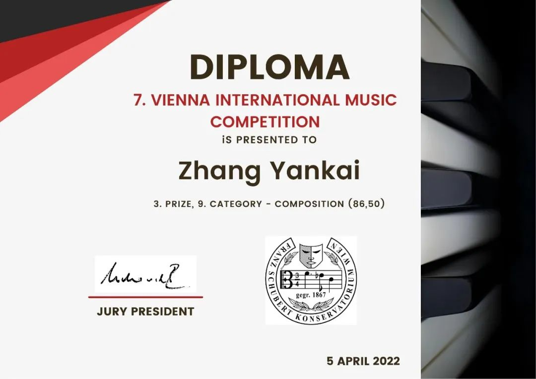 維也納弗朗茨·舒伯特音樂學(xué)院和“國(guó)際當(dāng)代音樂節(jié)”合作面向全球所有國(guó)家和地區(qū)不同年齡段的作曲家征集作品,分為10個(gè)組別進(jìn)行投稿評(píng)比,評(píng)委由多個(gè)國(guó)家的優(yōu)秀作曲家組成。經(jīng)過評(píng)委會(huì)匿名評(píng)審打分,最終,王博文的作品《Unique》(指導(dǎo)老師:白晨)獲電子音樂組二等獎(jiǎng),張顏開的作品《Fallen Relics》(指導(dǎo)老師:姜超遷)獲電影音樂組三等獎(jiǎng)。