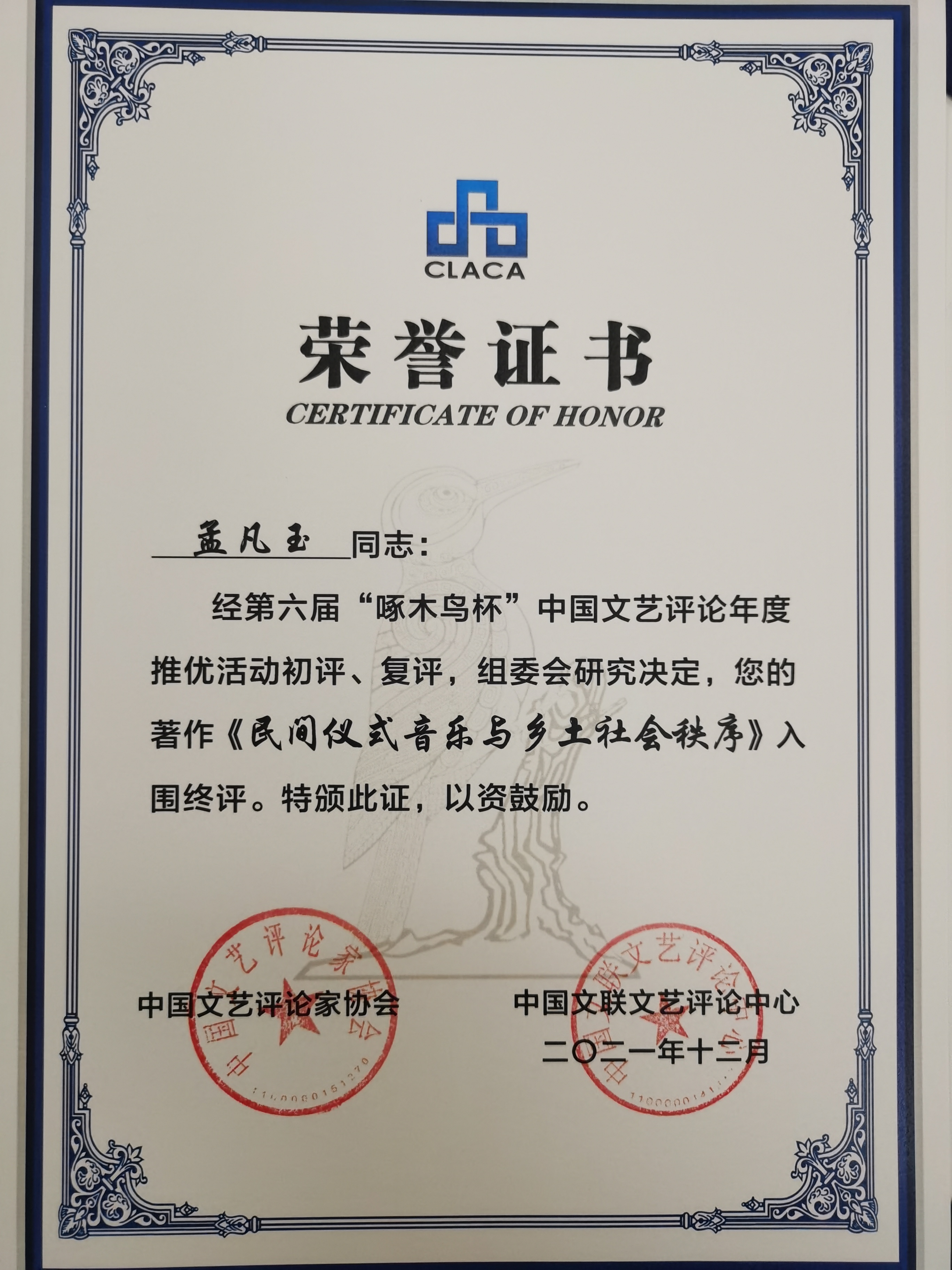 近日,學(xué)院圖書館館長、音樂學(xué)系教授孟凡玉的著作《民間儀式音樂與鄉(xiāng)土社會秩序》,在第六屆“啄木鳥杯”中國文藝評論年度推優(yōu)活動中入圍終評。