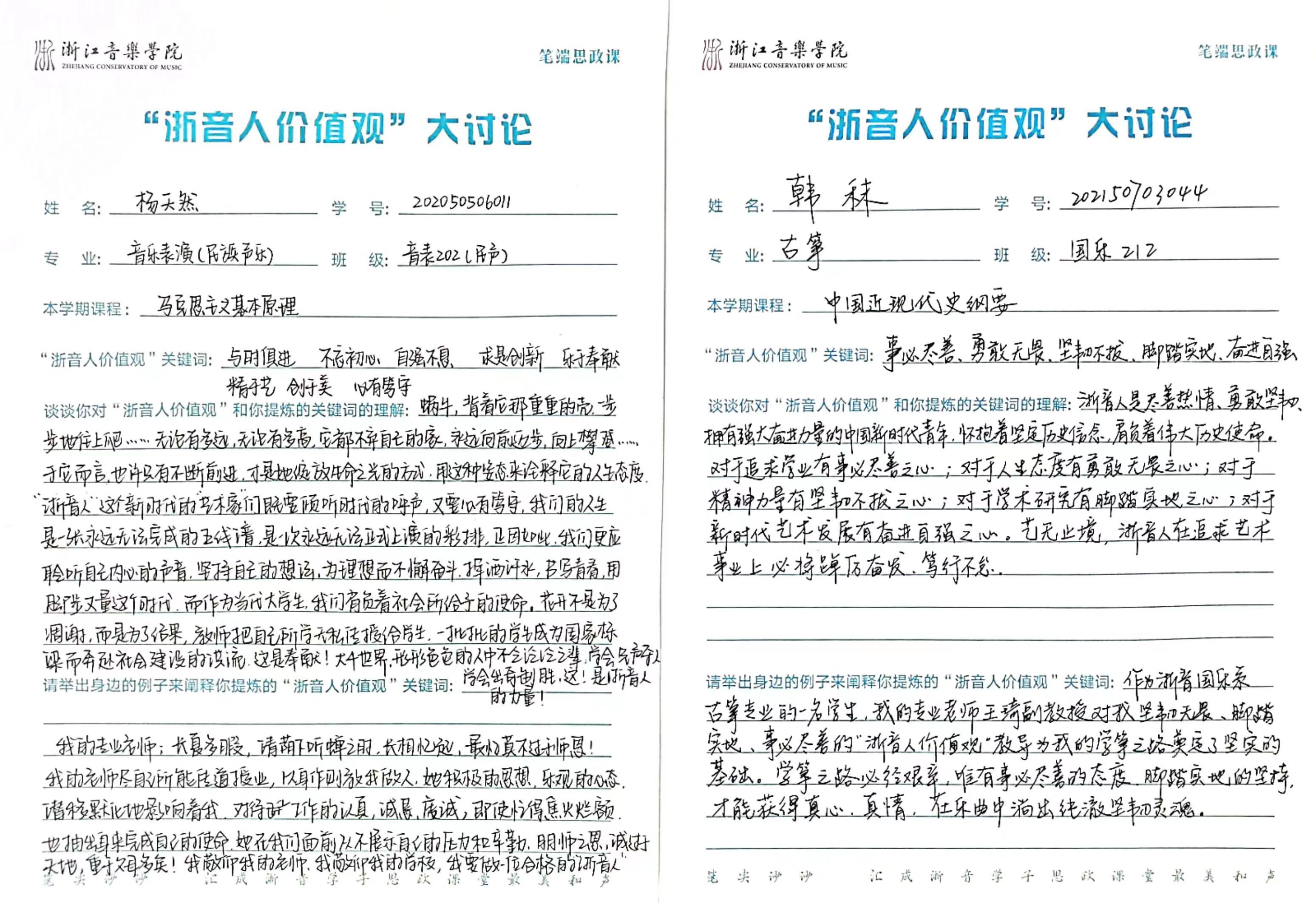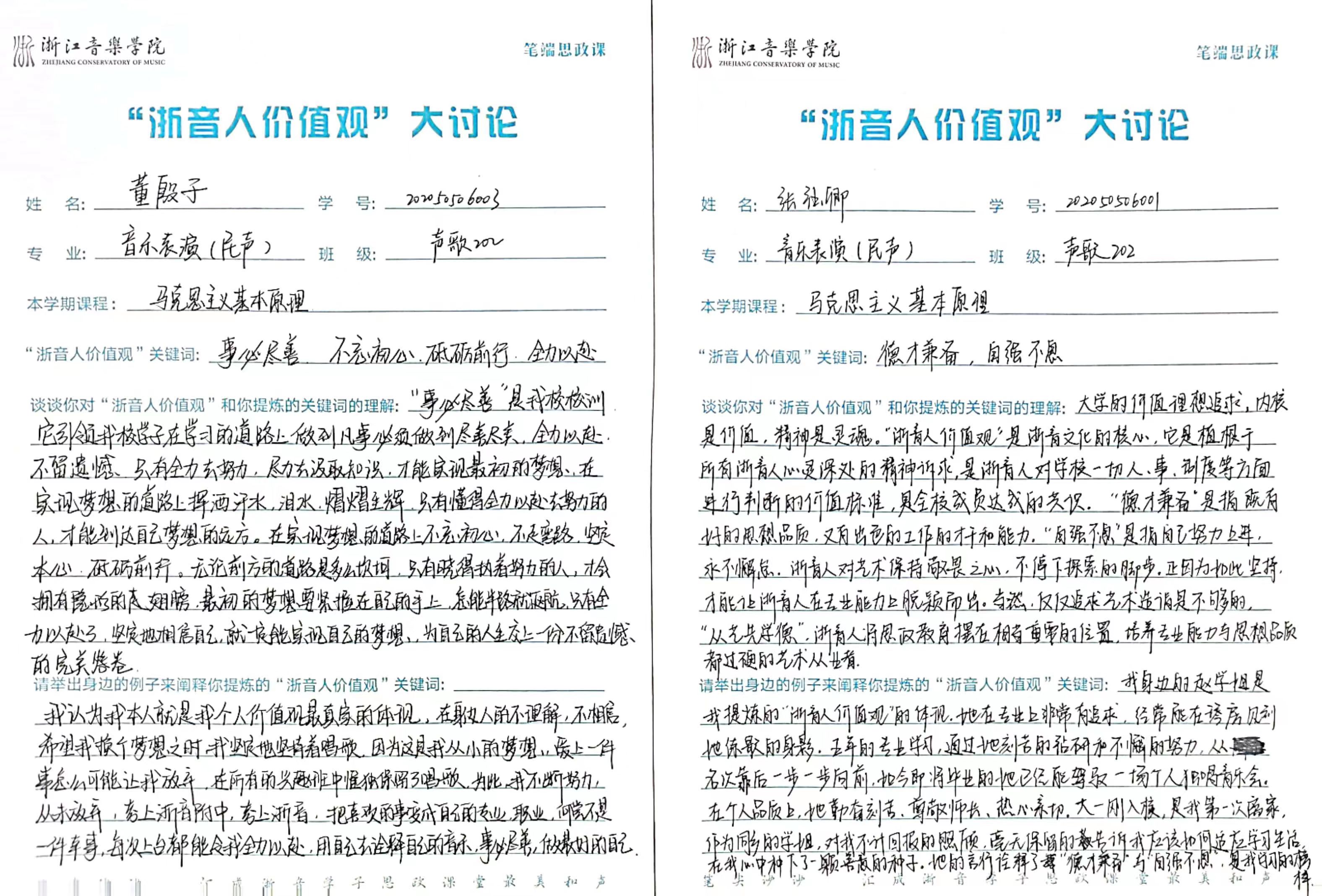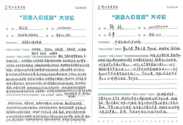 按照學(xué)院動員發(fā)動和集中研討的階段性要求,全體思政課教師認(rèn)真學(xué)習(xí)習(xí)近平總書記關(guān)于教育重要論述,深刻領(lǐng)會總書記對文化文藝工作的重要指示精神等,充分了解“浙音人價值觀”大討論的意義,以結(jié)合教材、融入課堂的方式,引導(dǎo)學(xué)生開展廣泛深入討論,并創(chuàng)新性地以“筆端思政課”為載體,讓學(xué)生將對“浙音人價值觀”的感悟和感受運于筆端。在討論中,“事必盡善”“德藝雙馨”“不忘初心”“盡善盡美”“立于德、精于藝、創(chuàng)于美”等是高頻詞匯,充分展示了浙音學(xué)子的精神面貌。目前,“浙音人價值觀”大討論在思政課教學(xué)中實現(xiàn)了全員參與、全員討論,累計1300多名學(xué)生參與。