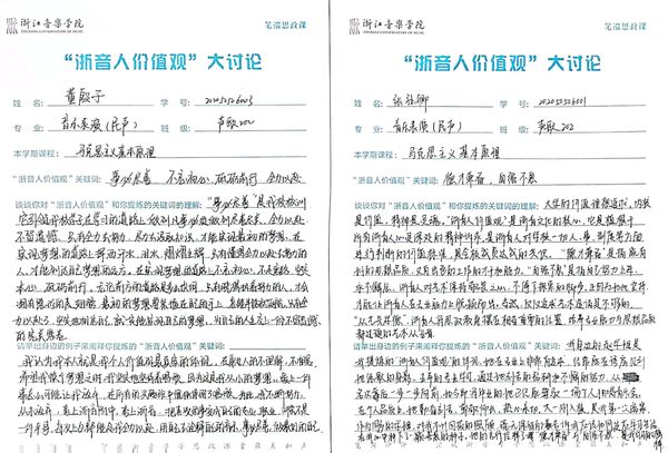 日前,按照學(xué)院黨委開展“浙音人價值觀”大討論活動要求,馬克思主義學(xué)院在直屬黨支部統(tǒng)一安排和部署下,以“筆端思政課”為載體,在思政課課堂中全面布置、扎實開展“浙音人價值觀”大討論。