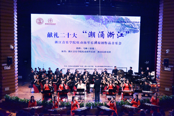 當(dāng)晚,獻(xiàn)禮二十大 “潮涌浙江”——浙江音樂學(xué)院炫動揚(yáng)琴樂團(tuán)原創(chuàng)作品音樂會在長沙音樂廳驚艷亮相。音樂會由學(xué)院炫動揚(yáng)琴樂團(tuán)與湖南民族樂團(tuán)聯(lián)袂演出,中央音樂學(xué)院青年指揮家馬帥擔(dān)任指揮。本次演出的所有曲目均為知名作曲家、學(xué)院作曲與指揮系副教授王云飛委約創(chuàng)作,借助帶有浙江氣質(zhì)的詩書畫意象,展現(xiàn)浙江的深厚底蘊(yùn)和發(fā)展活力。音樂會共分為“水墨江南”“錢塘風(fēng)骨”“之江聽潮”三個篇章,分別以古代浙江、近代浙江、現(xiàn)代浙江為主題,以典雅的“詩畫浙江”為線索,用民族器樂的獨(dú)奏、重奏、協(xié)奏等多種藝術(shù)形式,豐富立體地展現(xiàn)出浙江綠水青山的風(fēng)光畫卷、渾厚悠遠(yuǎn)的人文底蘊(yùn),以及新時代浙江在黨中央的帶領(lǐng)下,作為“重要窗口”的優(yōu)秀踐行者、“兩個先行”的勇敢探路者,在兩個一百年交匯點(diǎn),勇立潮頭、乘風(fēng)破浪,實(shí)現(xiàn)中華民族偉大復(fù)興的中國夢的昂揚(yáng)姿態(tài)。