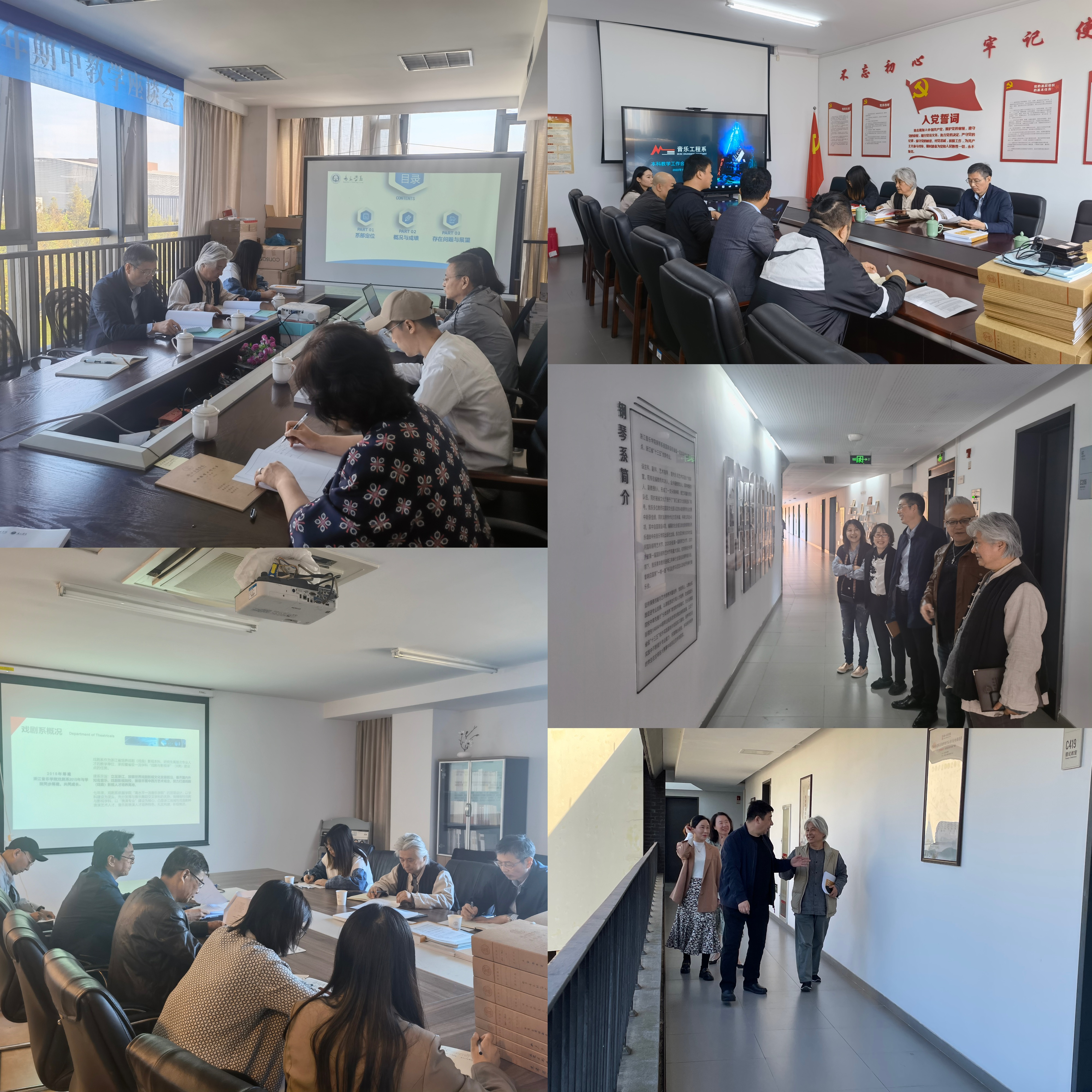 走訪過程中,楊九華參觀了各教學(xué)單位的文化墻布置,翻閱相關(guān)材料,聽取本科教學(xué)工作匯報。他充分肯定了各教學(xué)單位前期迎評準備工作,表示各單位高度重視、齊心協(xié)力,充分發(fā)揮主觀能動性,使各單位環(huán)境煥然一新。同時,他還提出了再提高、再打磨、再強調(diào)的要求,并要求各單位在展示教學(xué)成果實物時,要增加實物的品類和數(shù)量,傳遞既豐富又有序的視覺感受;匯報時需進一步凝練特色,體現(xiàn)辨識度高的辦學(xué)理念和成果,增加演出視頻等動態(tài)素材;要加強對教風(fēng)學(xué)風(fēng)的管理,確保教學(xué)工作有序穩(wěn)定。
