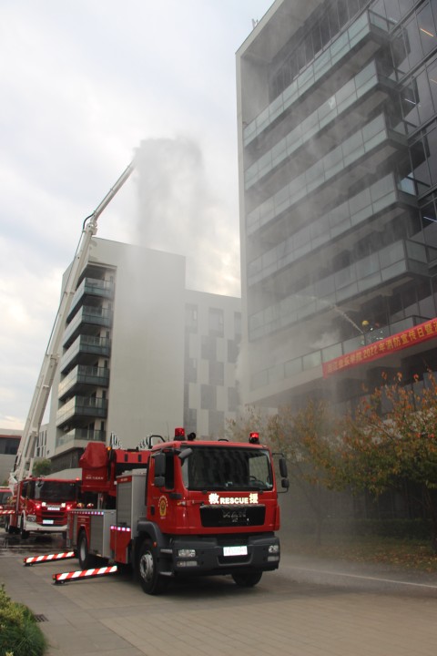 本次演練分為人員逃生疏散、油盆火災撲救兩個階段。隨著現(xiàn)場總指揮宣布演習正式開始,消防警報響起,校衛(wèi)隊3名應急隊員接到校園110指揮中心救援指令后,身著救援服,攜帶水帶、滅火器等器械迅速趕到著火點,指揮引導樓內學生有序疏散,并打開室內消火栓進行火災撲救。戰(zhàn)勤保障大隊云梯車也第一時間抵達公寓樓下,隨著云梯的升起,四樓陽臺內的被困學生被順利解救,水罐車、高噴車也配合展開了高空滅火作業(yè)。疏散演練結束后,消防教官進行了點評,對消防滅火器操作相關知識作了講解和示范,隨后模擬初期火情,引導師生使用滅火器進行撲滅實操演練。