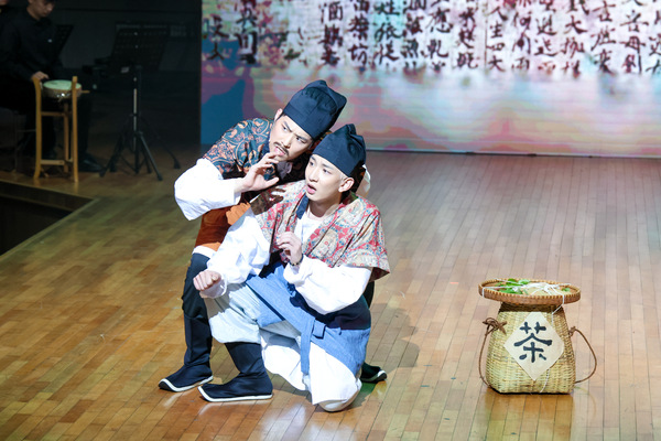 《茶酒論》是《中國(guó)戲曲志·甘肅卷》中收錄的敦煌文獻(xiàn)遺存,根據(jù)抄錄流傳下來最完整的版本來看,其創(chuàng)作于晚唐時(shí)期,出自晚唐鄉(xiāng)貢進(jìn)士王敷之筆。原文獻(xiàn)內(nèi)容通過擬人化的“茶”與“酒”的論爭(zhēng),反映了不同階層人群的生活態(tài)度,最后通過“水”的調(diào)解,制止了兩者的爭(zhēng)論,并告訴他們,沒有水,他們都不能成其所以然,所謂萬物和諧共生,從而化解了雙方的矛盾,表達(dá)了作者追求“以和為貴”的政治理念。原文本的內(nèi)容結(jié)構(gòu)、人物關(guān)系和故事情節(jié)相對(duì)完備,給后人留下了廣闊的創(chuàng)作空間。本劇便是在原文獻(xiàn)《茶酒論》的基礎(chǔ)之上研習(xí)創(chuàng)作,劇本從文獻(xiàn)的寫成背后、流傳背后、現(xiàn)代呈現(xiàn)三點(diǎn)一脈的視角切入,并展開想象,在探索敦煌文獻(xiàn)《茶酒論》前世今生的同時(shí),挖掘展現(xiàn)其背后的故事。全劇分為兩幕(上下兩闕),第一幕主以現(xiàn)代讀獻(xiàn)者與晚唐作者王敷、北宋抄錄者小和尚的對(duì)話,來展現(xiàn)王敷創(chuàng)作《茶酒論》的情懷背景與抄錄保護(hù)敦煌古文獻(xiàn)的流傳歷程,為引出正戲《茶酒論》作為鋪墊。第二幕主要對(duì)是原文獻(xiàn)《茶酒論》的創(chuàng)作解讀與舞臺(tái)重現(xiàn)。在創(chuàng)演的過程中,演員的表演狀態(tài)、形體動(dòng)作、音樂風(fēng)格等都力求靠近唐代歌舞戲的樸拙感,在表達(dá)原文獻(xiàn)核心思想的同時(shí),將唐代“戲弄”表演風(fēng)格展現(xiàn)在觀眾面前,實(shí)現(xiàn)文獻(xiàn)內(nèi)容與舞臺(tái)形象、核心思想與人物情感的有機(jī)融合,發(fā)揮它本身的藝術(shù)價(jià)值與文化價(jià)值之外,也展現(xiàn)它超越時(shí)代的社會(huì)價(jià)值。