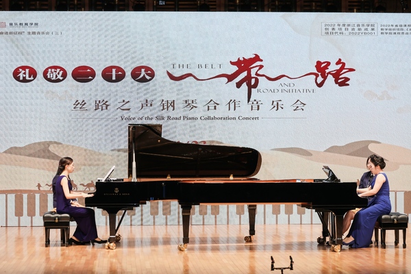 據(jù)悉,鋼琴合作課程作為一門多人多琴合作的小組實踐課,于2019年秋季在音樂教育學院正式開課,是浙江音樂學院十三五期間第一批重點建設課程。課程建設目標與音教學院“多能一專”復合型專業(yè)人才的培養(yǎng)目標高度契合。經(jīng)過兩年多的實踐,該課程于2021年榮獲浙江省高校課程思政優(yōu)秀教學案例一等獎,成為開展課程思政的重要陣地。此次音樂會從立意、選曲到參演人員,始終將課程思政的教學理念融會貫通,旨在用藝術的表現(xiàn)手法,以鋼琴合作為主要藝術形式,在弘揚中華優(yōu)秀傳統(tǒng)文化的基礎上,挖掘和展示“一帶一路”沿線國家獨特的音樂文化,在多元融合中闡釋“一帶一路”的精神內(nèi)涵與發(fā)展理念,講好絲路故事,傳播絲路之聲。