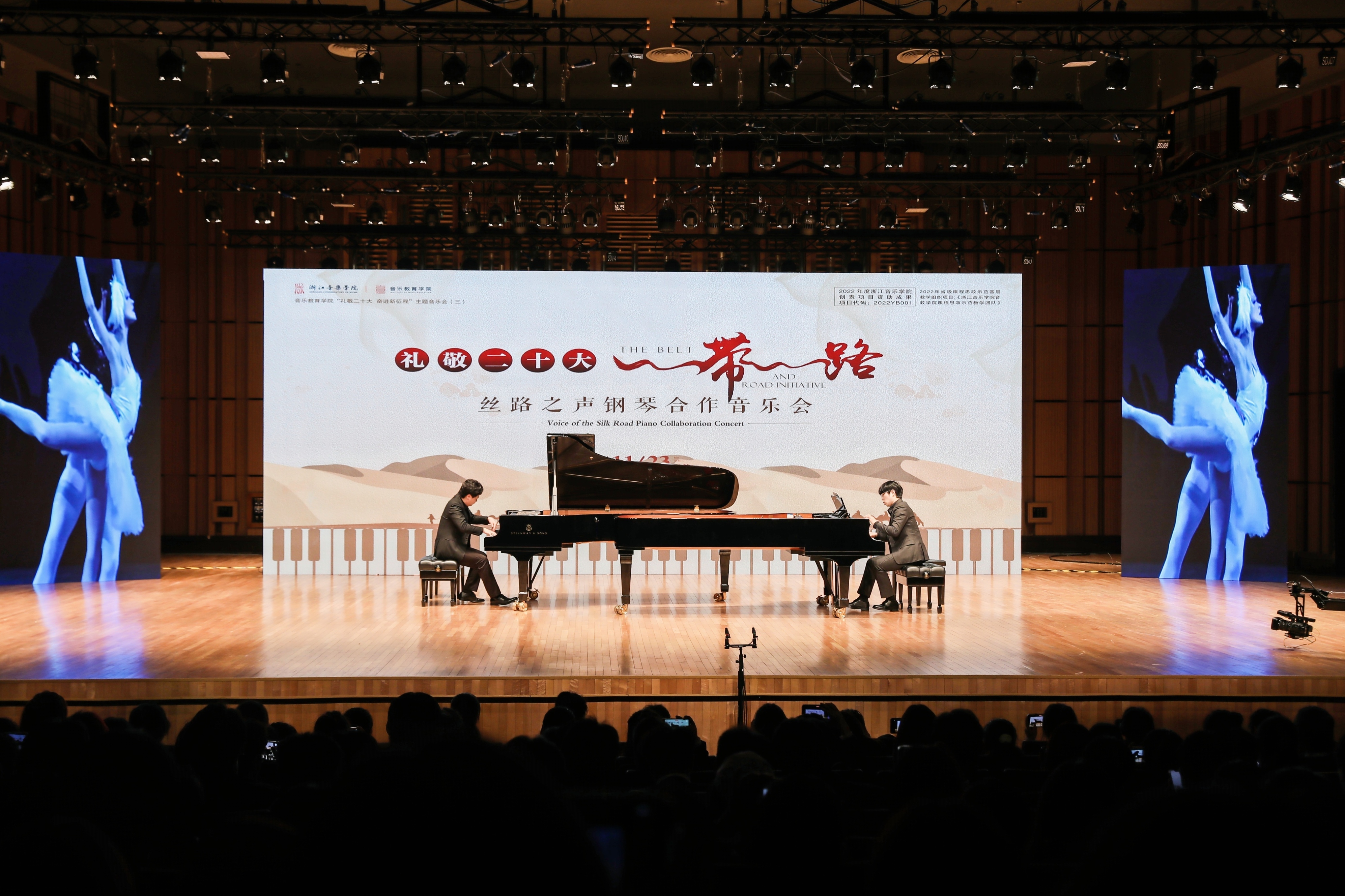 近日,音樂教育學院“禮敬二十大‘一帶一路’絲路之聲”鋼琴合作音樂會在標準音樂廳上演。黨委副書記蔡亦軍,副院長汪洋,以及學院相關職能部門負責人出席音樂會。