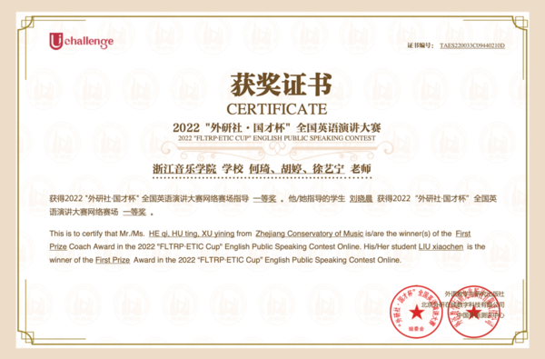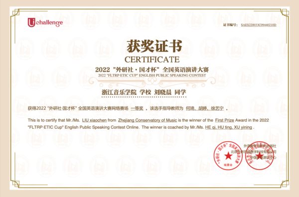 近日,第十七屆浙江省大學(xué)生英語(yǔ)演講競(jìng)賽暨2022年“外研社·國(guó)才杯”全國(guó)演講大賽通過(guò)線上線下相結(jié)合的方式舉辦,舞蹈學(xué)院21級(jí)研究生劉曉晨獲得全國(guó)一等獎(jiǎng),管弦系21級(jí)學(xué)生張海玥獲浙江賽區(qū)三等獎(jiǎng)。