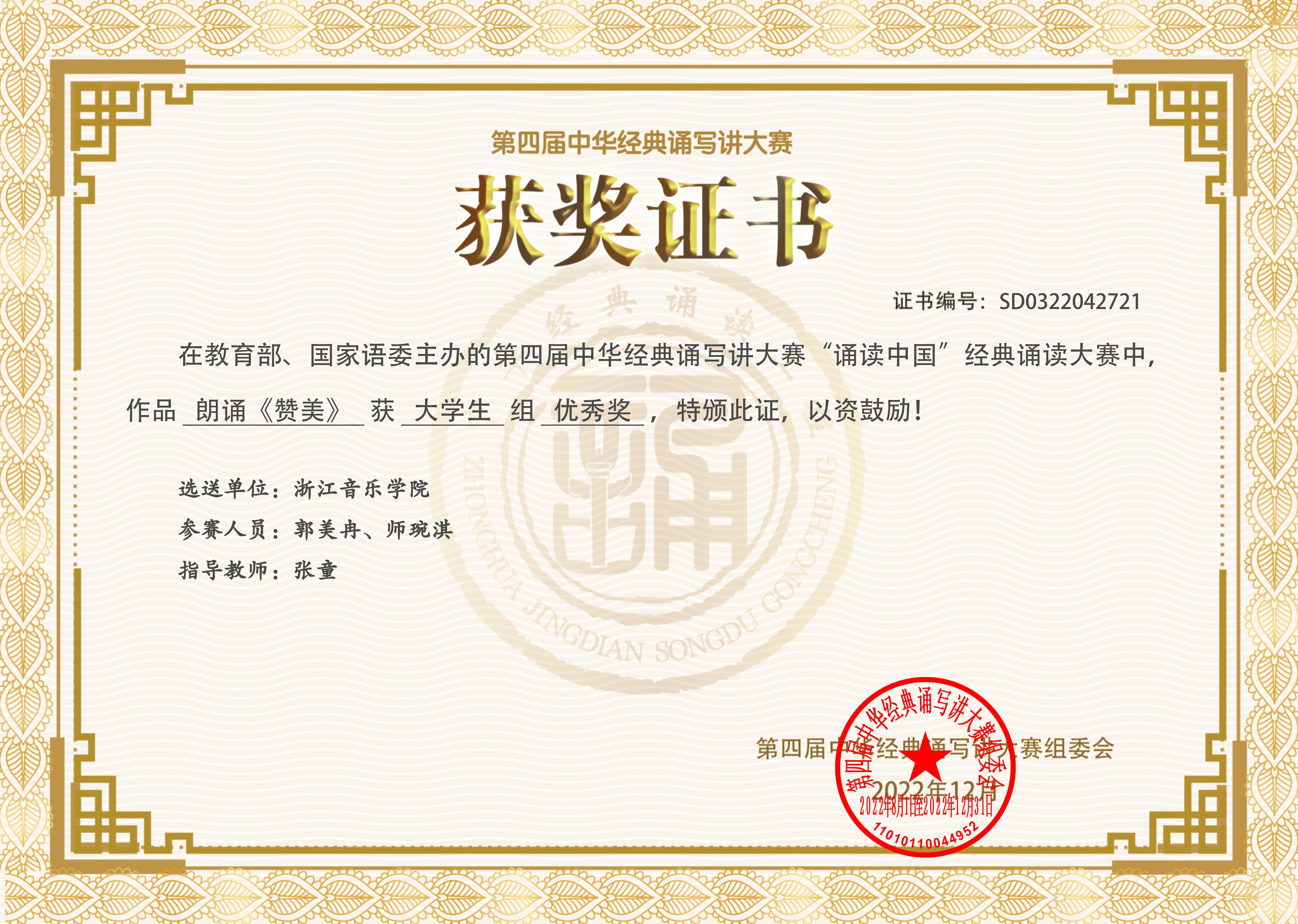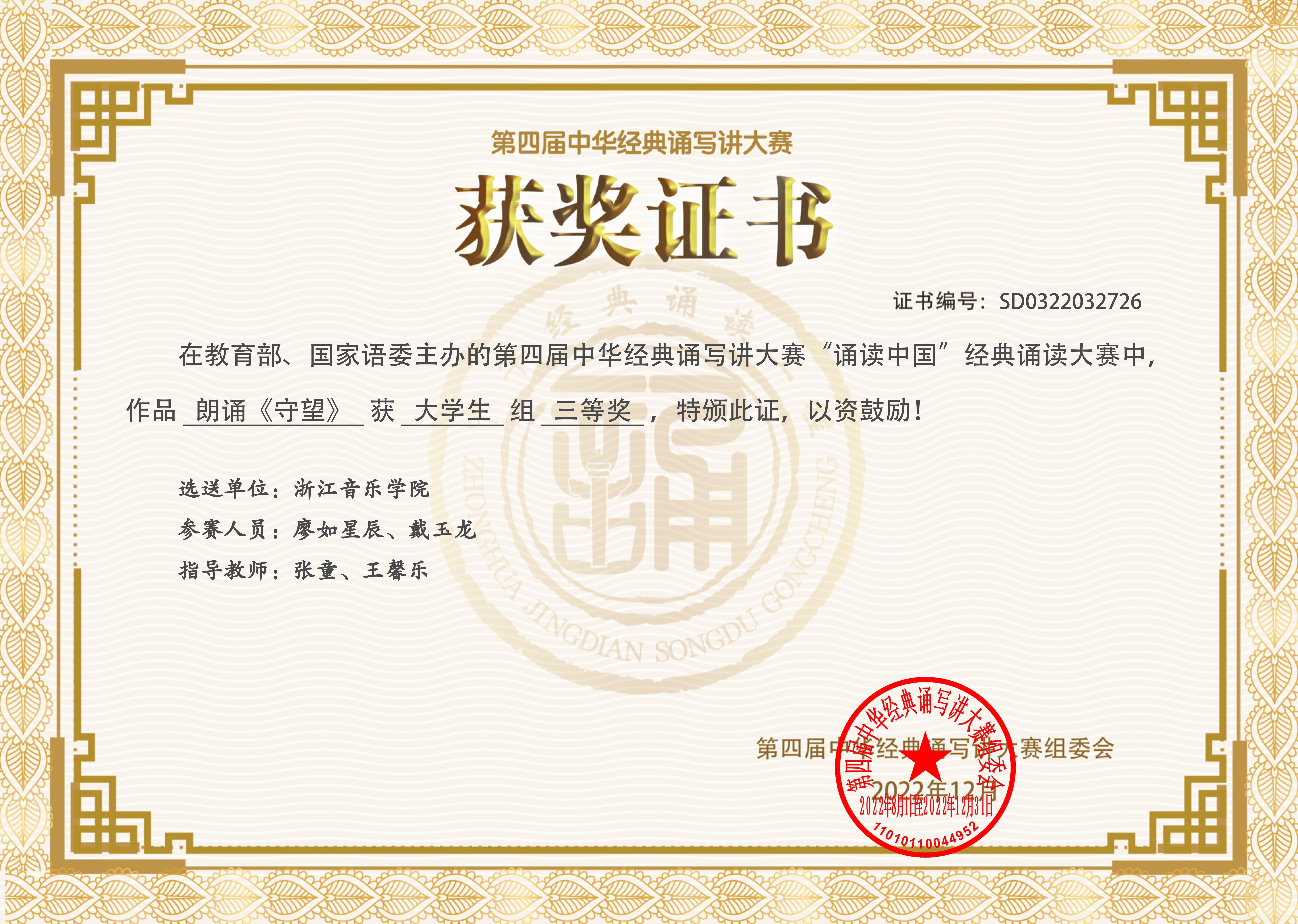 近日,由教育部、國家語委主辦的第四屆中華經(jīng)典誦寫講大賽“誦讀中國”經(jīng)典誦讀大賽全國總決賽落下帷幕,學(xué)院學(xué)生在文藝教研室主任張童和戲劇系教師王馨樂的指導(dǎo)下斬獲佳績。其中,戲劇系廖如星辰、戴玉龍的朗誦作品《守望》獲得三等獎(jiǎng),郭美冉、師琬淇的朗誦作品《贊美》獲得優(yōu)秀獎(jiǎng)。