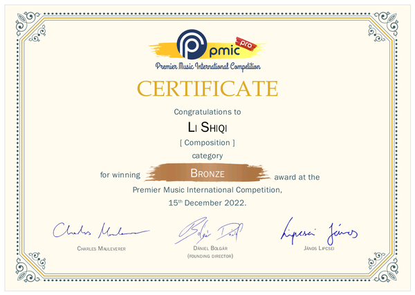 近日,第二屆匈牙利普利米爾音樂國際專業(yè)作曲比賽(Premier Music International Competition Pro)落下帷幕,作曲與指揮系學(xué)生李詩琪的室內(nèi)樂作品《夏夜山谷》(Summer Night in Valley)(指導(dǎo)教師:張昕副教授)榮獲銅獎(jiǎng)。
