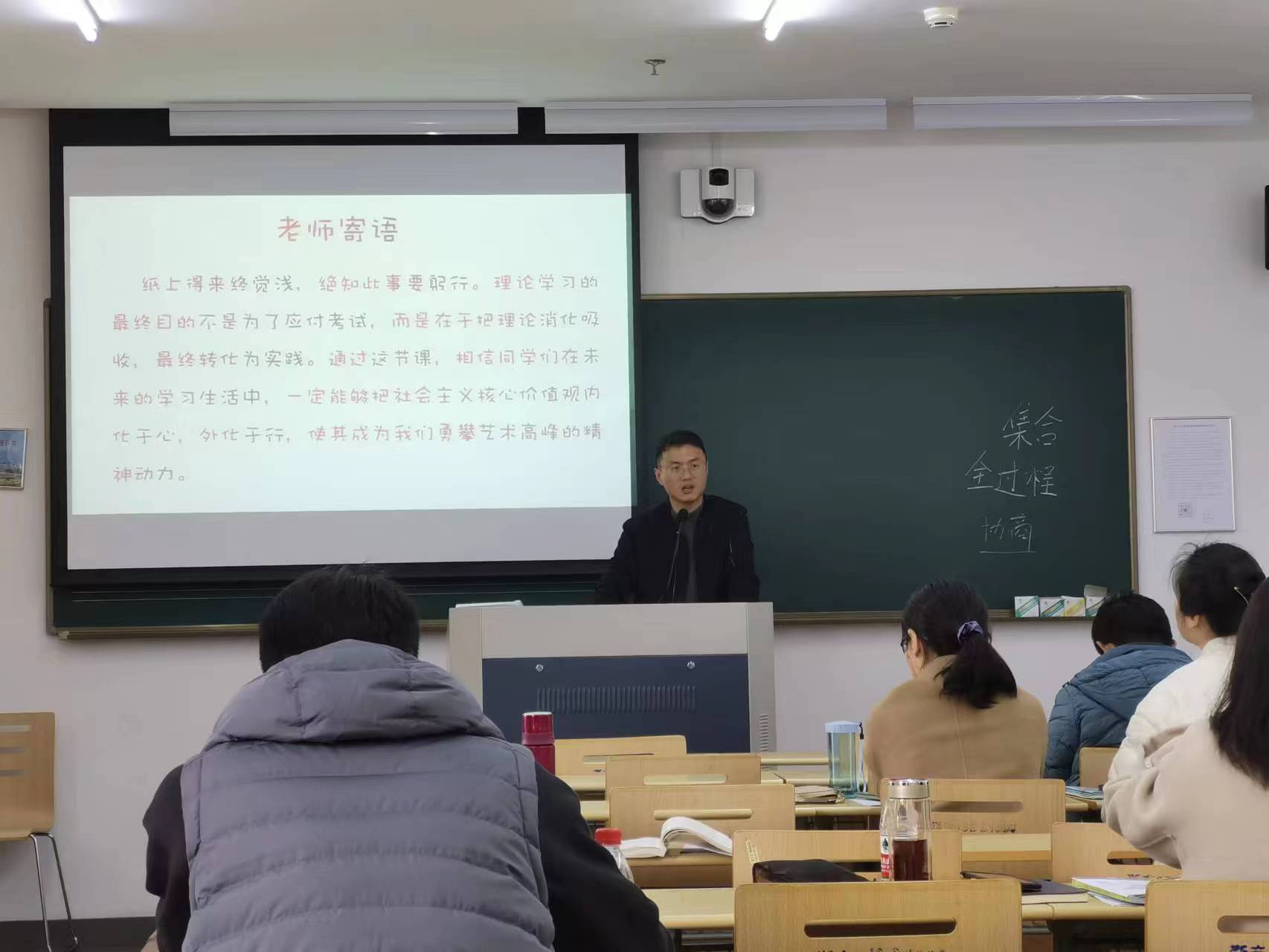 教研活動中,陸超逸老師以牛津詞典年度熱詞為導(dǎo)入,結(jié)合工作和壓力的關(guān)系以及時下熱點話題,運(yùn)用新媒體技術(shù)展示視頻、圖片、詩歌等資料,在充分互動中引導(dǎo)學(xué)生正確理性思考“如何平衡工作和休閑”。教學(xué)環(huán)節(jié)完整,內(nèi)容充實,較好調(diào)動了學(xué)生積極性與學(xué)習(xí)興趣,寓教于樂。張亮兆老師圍繞著社會主義核心價值觀展開講授,詳細(xì)分析了社會主義核心價值觀的內(nèi)涵,邏輯嚴(yán)整,層次清晰,準(zhǔn)確把握了教材主線和知識點,也充分結(jié)合自身研究志趣為課堂注入新元素。