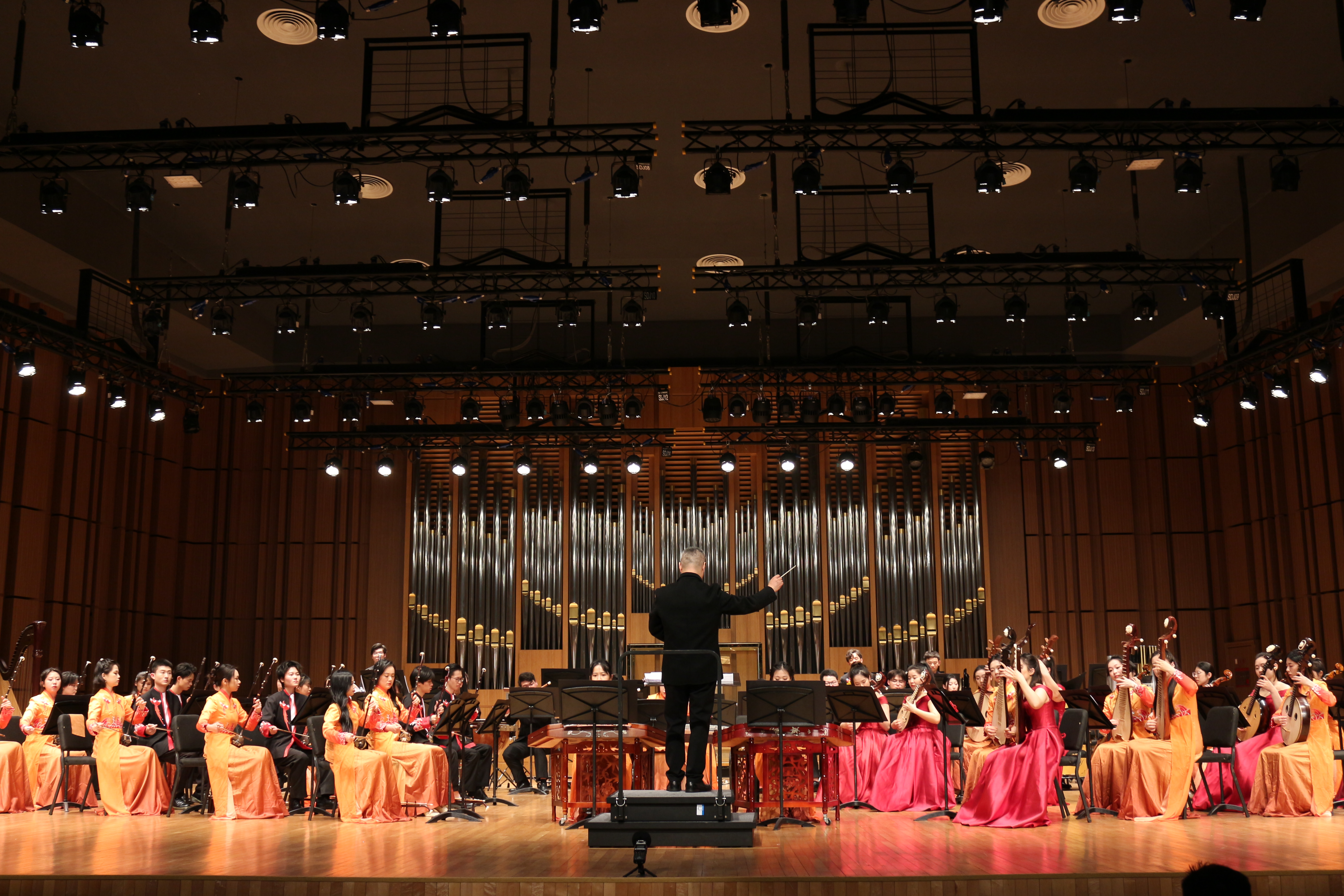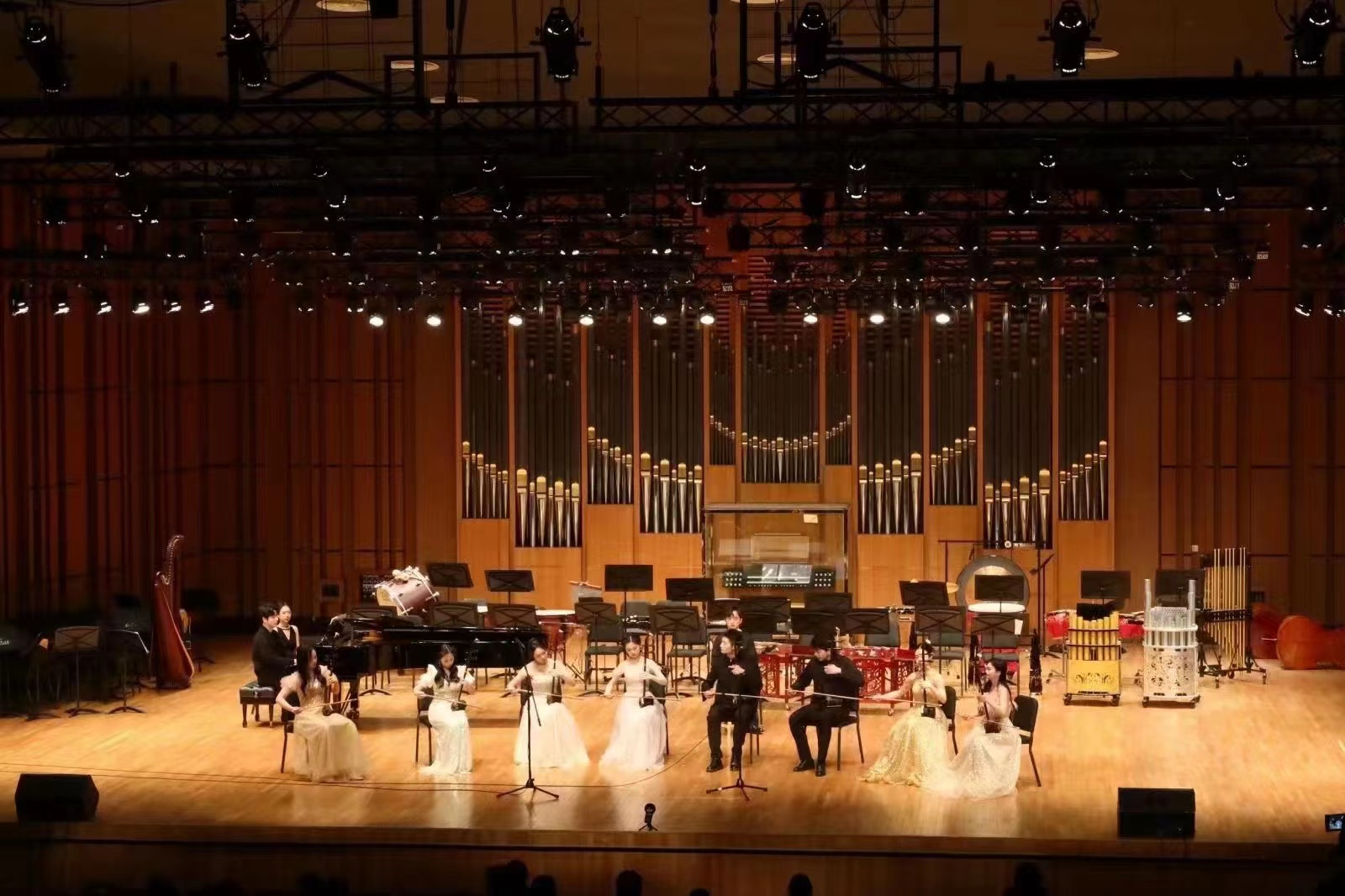 本屆音樂會由戲曲音樂伴奏12名本科畢業(yè)生共同演奏了9首音樂作品,戲劇系國家一級指揮阮明奇指揮。作品涵蓋了越劇、民族器樂合奏、獨奏和重奏等多種形式,包括由劉建寬創(chuàng)作的越劇《穆桂英掛帥》和《惜別離》,寧波市演藝集團專職作曲汪鋒創(chuàng)作的民族器樂曲《南詞賦》,義烏市婺劇保護傳承中心青年作曲陳廣亮創(chuàng)作的民族器樂曲《婺途》,作曲家李博禪創(chuàng)作的琵琶獨奏《晚秋》,作曲家劉文金創(chuàng)作的二胡重奏《長城隨想》,作曲家Alex Fox創(chuàng)作、陳家榮改編的阮族重奏《阮之火》,余姚市姚劇保護傳承中心青年作曲楊雙儉創(chuàng)作的民族器樂曲《火工》,學院國樂系笙副教授楊磊老師和青年作曲家何諧聯(lián)袂創(chuàng)作的笙與樂隊《一笙·一世》?,F(xiàn)場,嘹亮高亢的高胡、極具表現(xiàn)力的二胡、低沉渾厚的中胡、“大珠小珠落玉盤”的彈撥樂器、自由灑脫的打擊樂、溫婉合群的琵琶和清雅委婉的笛子等,共同引領聽眾踏上一段精彩的中華傳統(tǒng)音樂之旅。演出在觀眾熱烈的掌聲和喝彩聲中圓滿落幕。