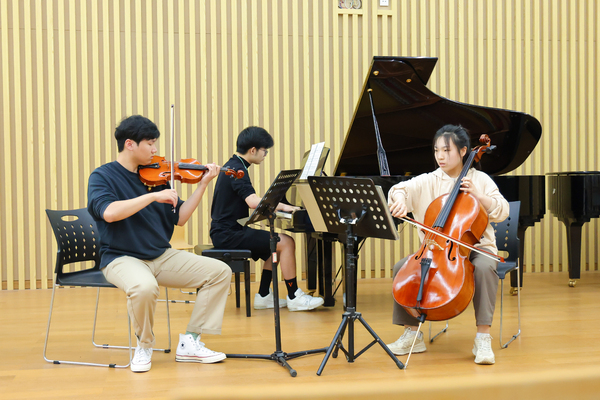 大師班上,室內(nèi)樂學(xué)院的兩組學(xué)生分別演奏了貝多芬的《降E大調(diào)鋼琴三重奏》和《D大調(diào)鋼琴三重奏“幽靈”》,并得到了張薇聰?shù)闹更c。她對兩首作品進(jìn)行了生動細(xì)致的講解,并對鋼琴與弦樂音色的融合提出了思考方法和解決辦法,例如,鋼琴如何盡可能地模仿弦樂連奏、弦樂怎樣演奏出鋼琴的顆粒性等,并強調(diào)了演奏者應(yīng)通過音色的需求,合理運用鋼琴踏板等。此外,她還講解了區(qū)分中、低聲部音樂性格的重要性。在張薇聰?shù)南ば闹笇?dǎo)下,學(xué)生們對室內(nèi)樂演奏藝術(shù)有了更深入的理解和思考,對于作品風(fēng)格的把控,以及音樂層次的處理也表現(xiàn)得更為精準(zhǔn)恰當(dāng)。