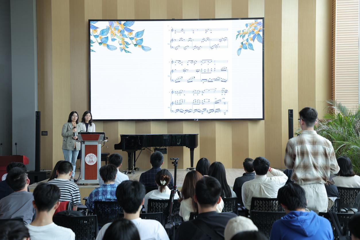 活動現(xiàn)場,作曲與指揮系教研室主任張澤藝、人文社科部文藝教研室主任張童共同展開了一場精彩的音樂與文學(xué)的對話。張童圍繞“如何讀懂一首詩”這一主題,通過解讀《夜雨寄北》《洛橋晚望》《春題湖上》《致橡樹》等經(jīng)典詩詞,闡釋了詩詞如何通過“聲音”“語意”等方式表達思想和情感,以及讀者應(yīng)如何體會詩詞作品的音韻美和哲理思想。張澤藝用《紅樓夢》原聲主題音樂引出音樂創(chuàng)作中詩與樂的思考。她講解了原創(chuàng)藝術(shù)歌曲《春題湖上》的創(chuàng)作思路和技法,強調(diào)用具有時代性的音樂語言傳播古典詩詞和現(xiàn)代詩歌,是當(dāng)代作曲家的重要使命。
