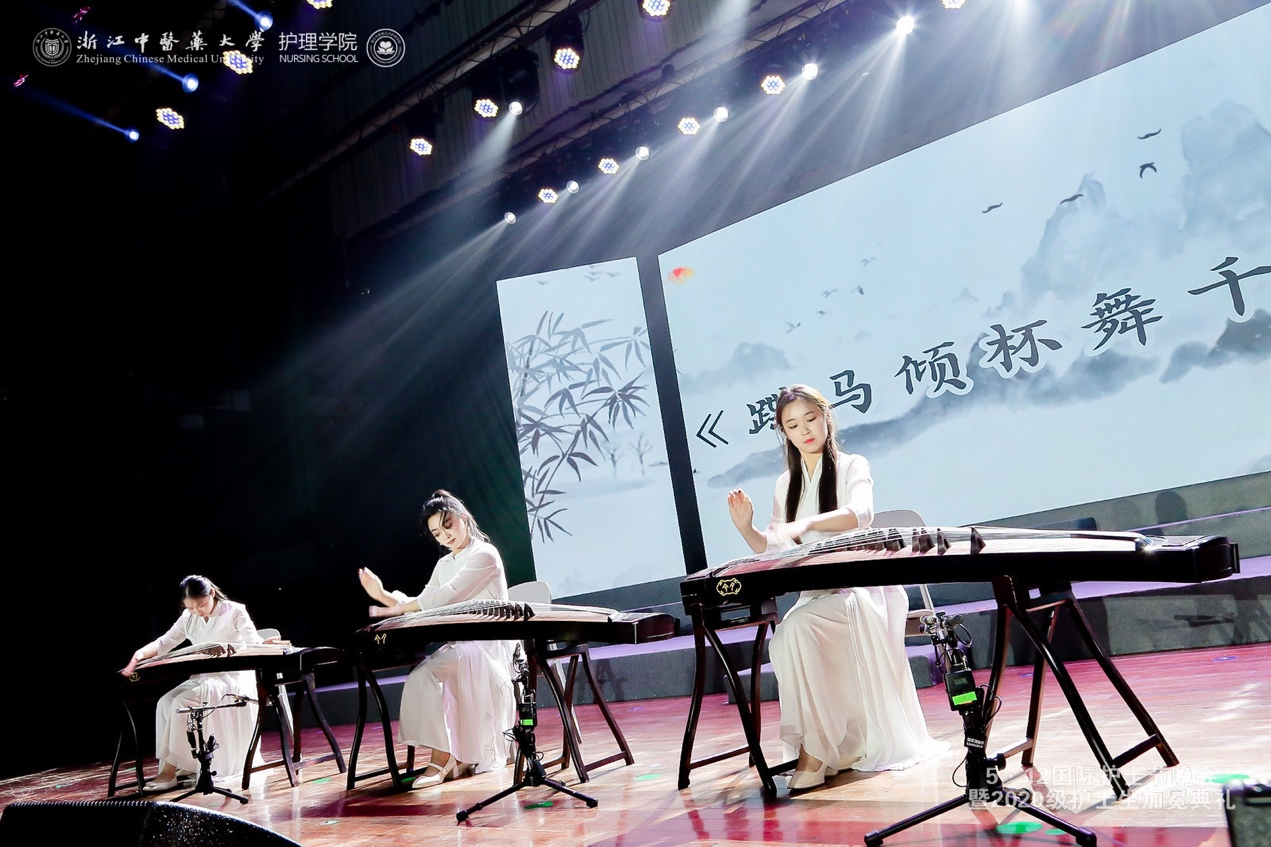 在浙江中醫(yī)藥大學護生加冕典禮的現(xiàn)場,古箏重奏《蹀馬傾杯舞千秋》氣場全開,琴弦舞動、蒼韻松古,繞梁余音像月華般傾瀉在每位觀眾的心中。
