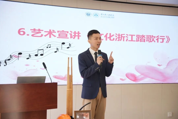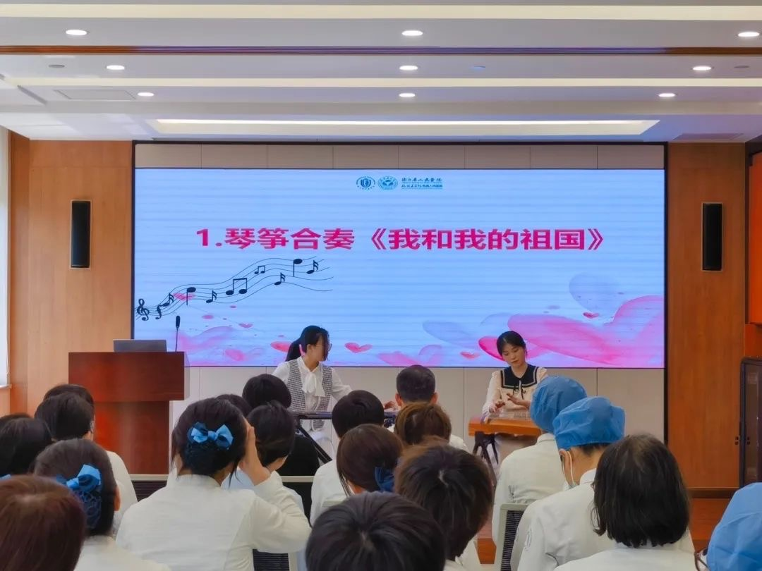 在植被繁茂、背倚青山的浙江省人民醫(yī)院望江山院區(qū),國樂學子演奏了琴箏合奏《我的祖國》、笛樂獨奏《三五七》、笙協(xié)奏曲《望夫石的美麗傳說》,用美妙樂聲致敬無私奉獻的醫(yī)護工作者們,校青年理論家宣講團王劉同學還帶來了精彩的藝術宣講。醫(yī)護工作者徜徉在悠揚動聽的絲竹樂聲之中,感受到來自音樂的溫暖與感動。