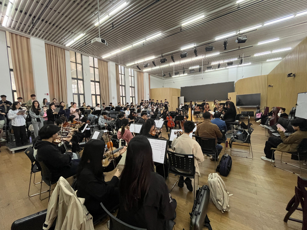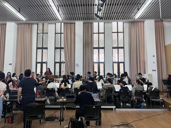 在排練中,大家準(zhǔn)時(shí)準(zhǔn)點(diǎn)到排練廳集合排練,每個(gè)人各司其職、配合默契,在無數(shù)次地重復(fù)排練中,每個(gè)聲部互相襯托、和諧有序,音樂顯得豐富又協(xié)調(diào)。那精益求精的態(tài)度是樂手的專業(yè)素養(yǎng),更是管弦系師生積極向上、求真務(wù)實(shí)的精神風(fēng)貌。最后的演出也不負(fù)眾望,樂團(tuán)的音響烘托極富感染力,將作品情節(jié)的渲染發(fā)揮到了極致,李清照跌宕起伏的一生被塑造得更加立體化、更加形象化。“生當(dāng)作人杰、死亦為鬼雄”,樂團(tuán)的音響起到了至關(guān)重要的作用,那寂寞、那凄涼、那悲愴,將全劇推向高潮。