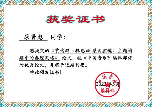 近日,《中國(guó)音樂》公布第四屆音樂學(xué)碩博研究生優(yōu)秀學(xué)位論文評(píng)選結(jié)果,我校2022屆作曲與指揮系碩士研究生原晉彪的《賈達(dá)群<狂想曲·梨園腔魂>主題構(gòu)建中的秦腔風(fēng)格》(指導(dǎo)教師:唐大林副教授)獲評(píng)《中國(guó)音樂》第四屆音樂學(xué)碩士研究生優(yōu)秀學(xué)位論文。