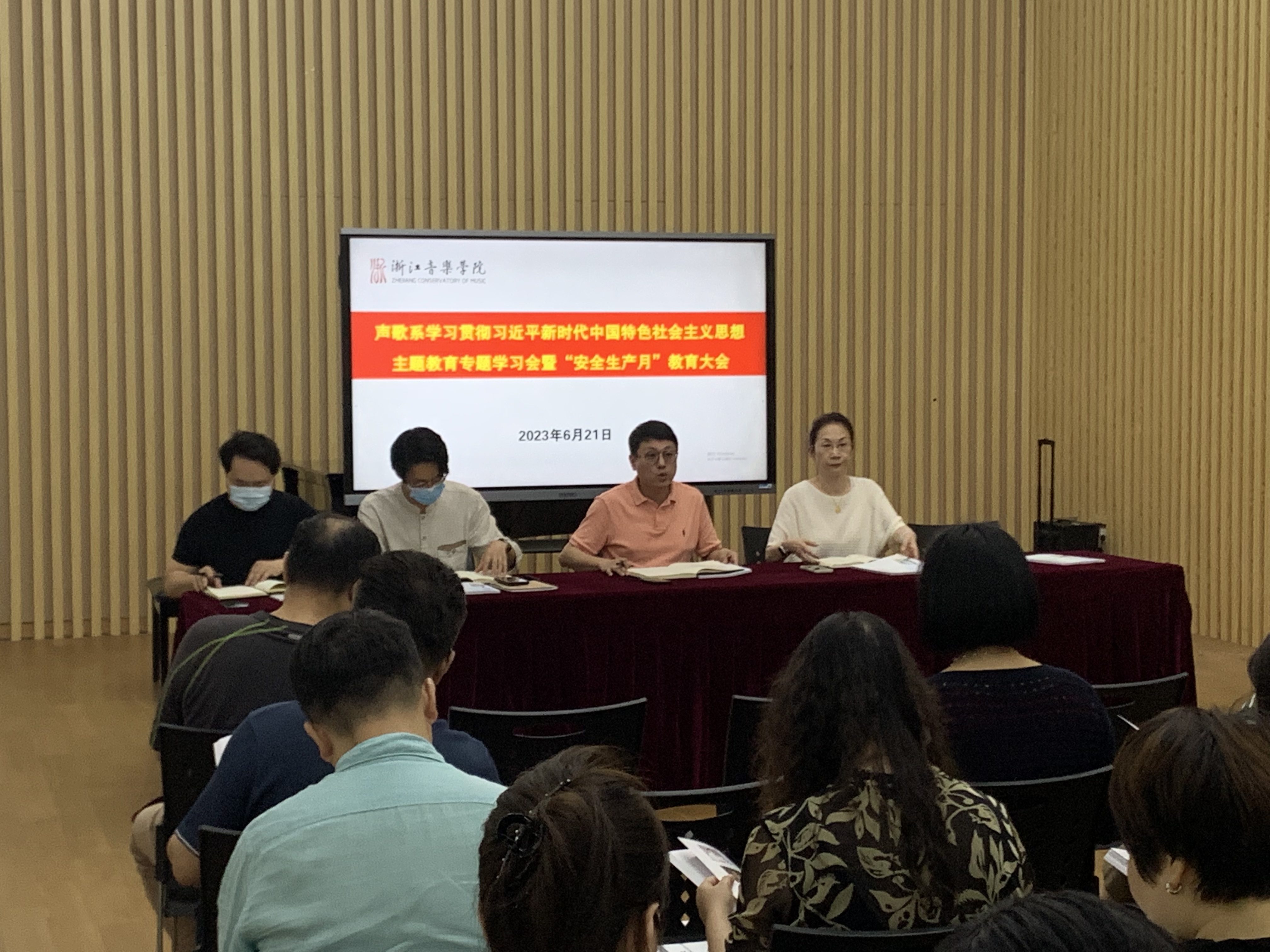 會(huì)議傳達(dá)學(xué)習(xí)了學(xué)院校園綜合治理委員會(huì)暨平安校園建設(shè)工作領(lǐng)導(dǎo)小組(擴(kuò)大)會(huì)議精神、《浙江音樂學(xué)院2023年“安全生產(chǎn)月”活動(dòng)方案》《浙江音樂學(xué)院校園控制吸煙管理辦法》的通知精神,集體觀看了《生命重于泰山——學(xué)習(xí)習(xí)近平總書記關(guān)于安全生產(chǎn)重要論述》的電視專題片,并對“人人節(jié)約一度電,同為低碳作貢獻(xiàn)”活動(dòng)作出倡議。會(huì)議強(qiáng)調(diào),要樹牢安全發(fā)展理念,充分認(rèn)識(shí)安全生產(chǎn)工作的重要性和緊迫性,增強(qiáng)做好安全生產(chǎn)工作的思想自覺、政治自覺和行動(dòng)自覺;要警鐘長鳴、常抓不懈,切實(shí)把安全責(zé)任扛在肩上,真正守住安全發(fā)展的底線和紅線,準(zhǔn)確把握高校安全穩(wěn)定面臨的新形勢新要求,防范化解各類安全風(fēng)險(xiǎn)。會(huì)議還就校園節(jié)能降耗、機(jī)動(dòng)車超速以及教師琴房、排練廳、學(xué)生寢室等區(qū)域的安全工作作了再強(qiáng)調(diào)和再部署,并對2023屆本科生畢業(yè)論文的自查情況作了通報(bào),對本學(xué)期末的各項(xiàng)教學(xué)工作作了專項(xiàng)部署。