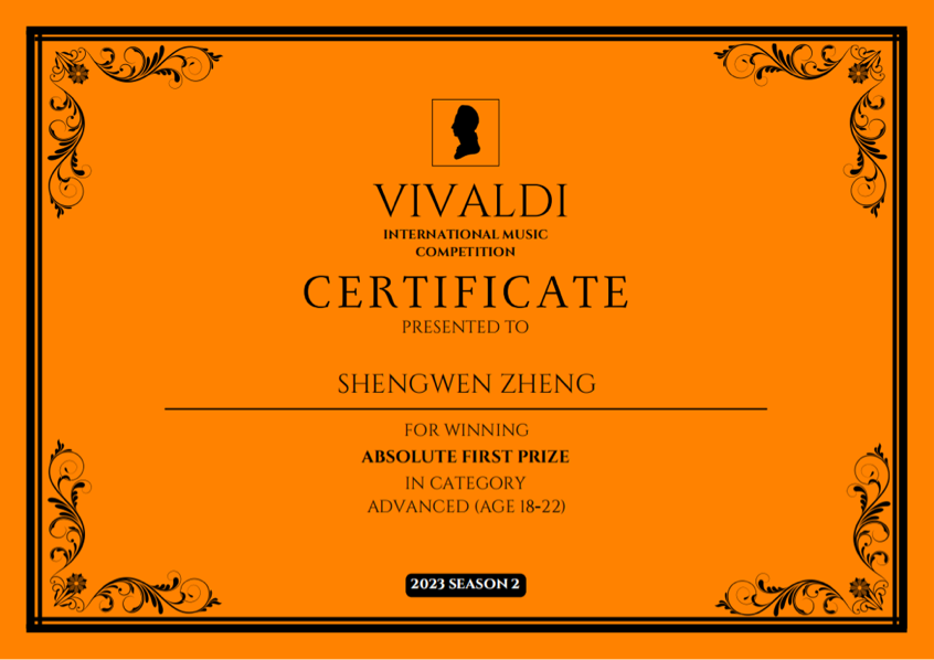 近日,維瓦爾第國(guó)際音樂(lè)比賽第二賽季(Vivaldi International Music Competition)落下帷幕,學(xué)院作曲與指揮系指揮221班鄭盛文(指導(dǎo)教師:周杰副教授)榮獲ADVANCED(AGE 18-22)高級(jí)組一等獎(jiǎng),并獲特別獎(jiǎng)——Excellent Technique獎(jiǎng)項(xiàng)。