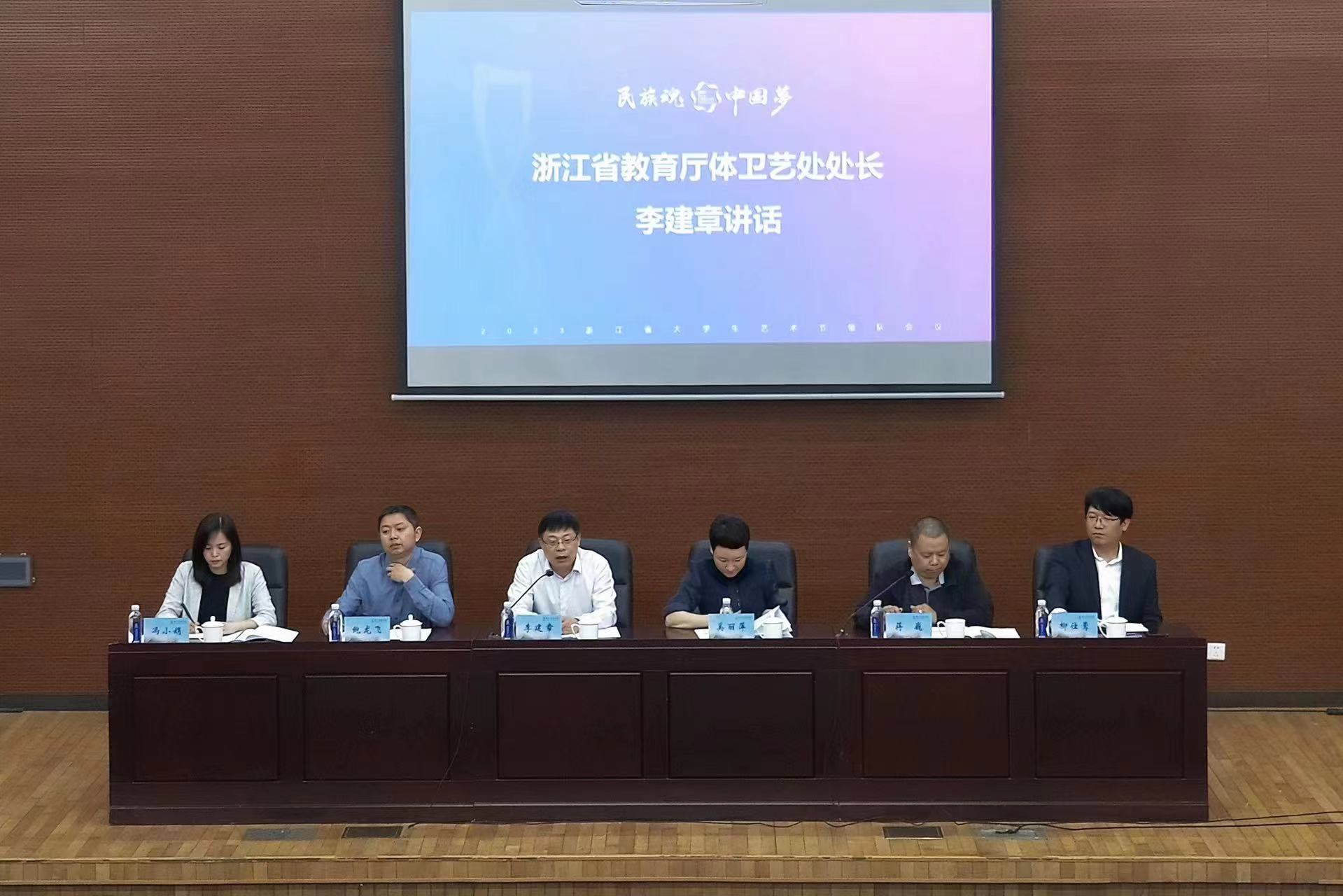 10月27日下午,2023年浙江省大學(xué)生藝術(shù)節(jié)領(lǐng)隊(duì)會議在學(xué)院AB學(xué)術(shù)報告廳舉行。浙江省教育廳體衛(wèi)藝處處長、二級巡視員李建章,學(xué)院副院長、黨委委員奚麗萍,省教育廳藝術(shù)處、藝術(shù)教育委員會相關(guān)負(fù)責(zé)人,學(xué)院藝術(shù)處、后勤與校園安全處相關(guān)負(fù)責(zé)人,本次大學(xué)生藝術(shù)節(jié)承辦工作領(lǐng)導(dǎo)小組成員,以及入圍本屆大學(xué)生藝術(shù)節(jié)現(xiàn)場展演的各高校領(lǐng)隊(duì)和指導(dǎo)教師出席會議。會議由學(xué)院藝術(shù)處負(fù)責(zé)人主持。