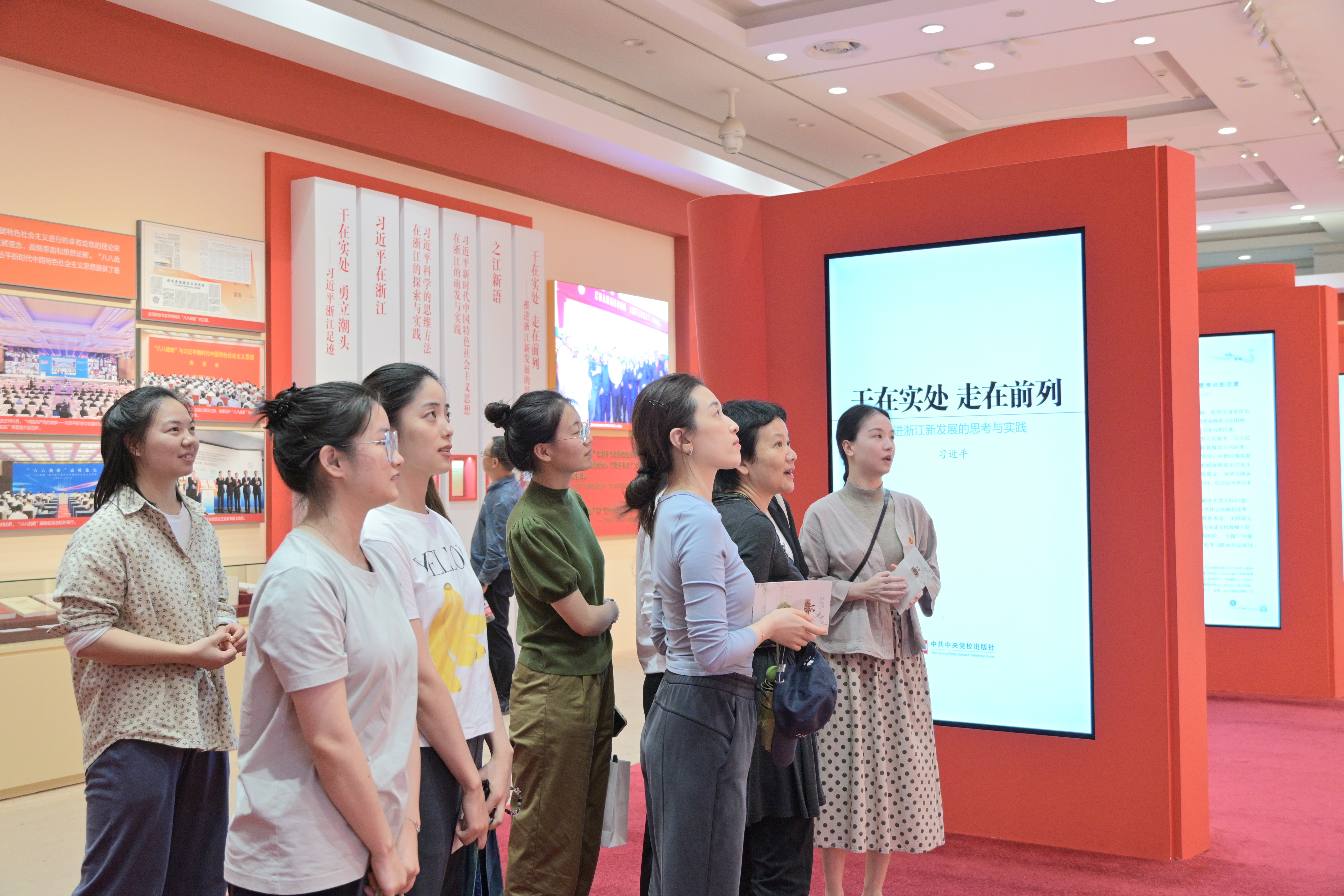 展覽以“大道之行”為主題。4500平方米的展陳,大氣鮮紅的底色一如浙江奮進的20年,亦如觀展時的激越心情。穿梭在文字、照片、視頻和實物模型構筑起來的“時空走廊”,欣賞綜合展區(qū)的“偉大擘畫”“精彩蝶變”“勇立潮頭”三大篇章和地方展區(qū)“共譜華章”,師生被20年來高潮迭起的奮斗歷程所激勵,也深深感受到“八八戰(zhàn)略”蘊含的人文性、前瞻性,以及所帶來的蓬勃朝氣和恢弘碩果。