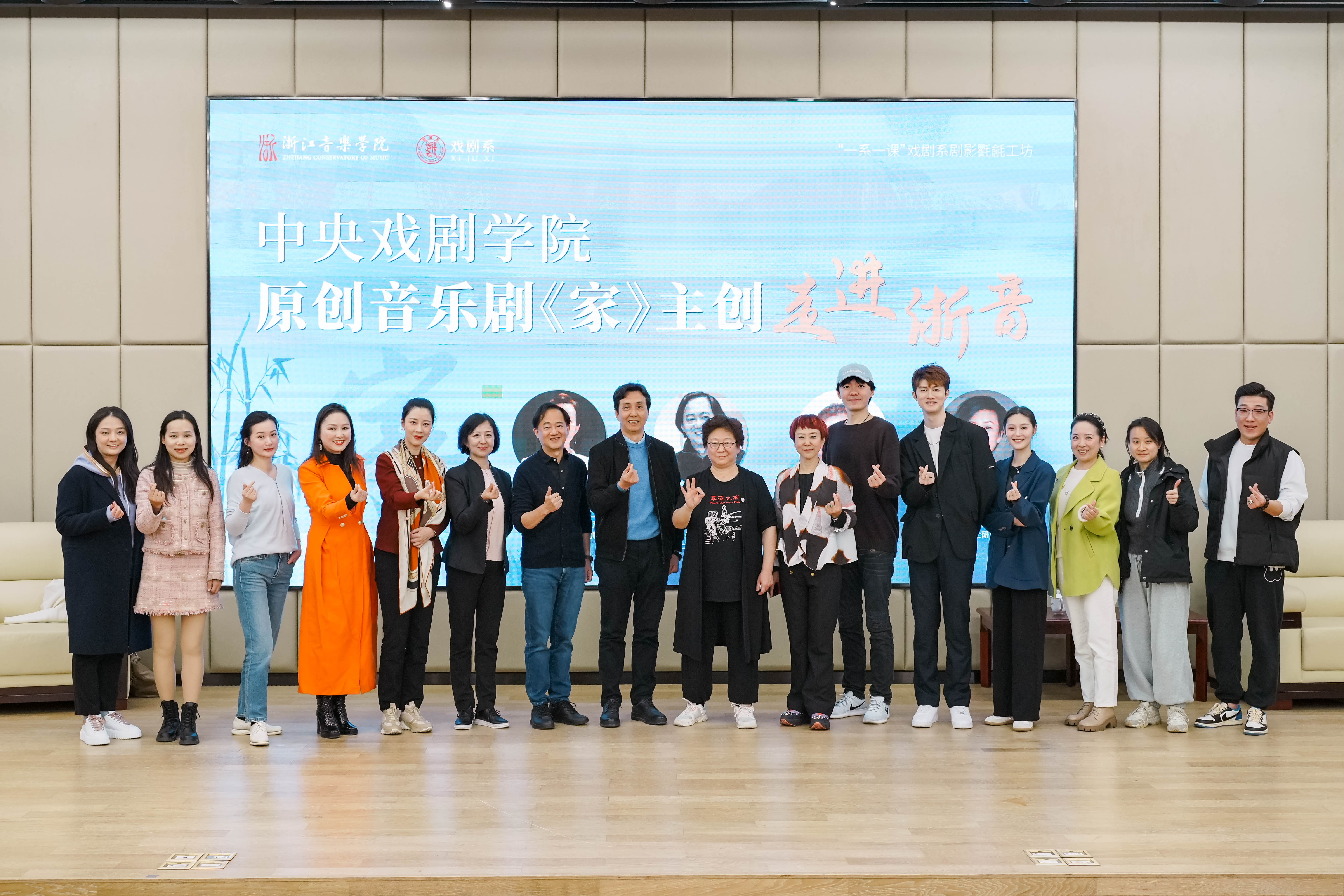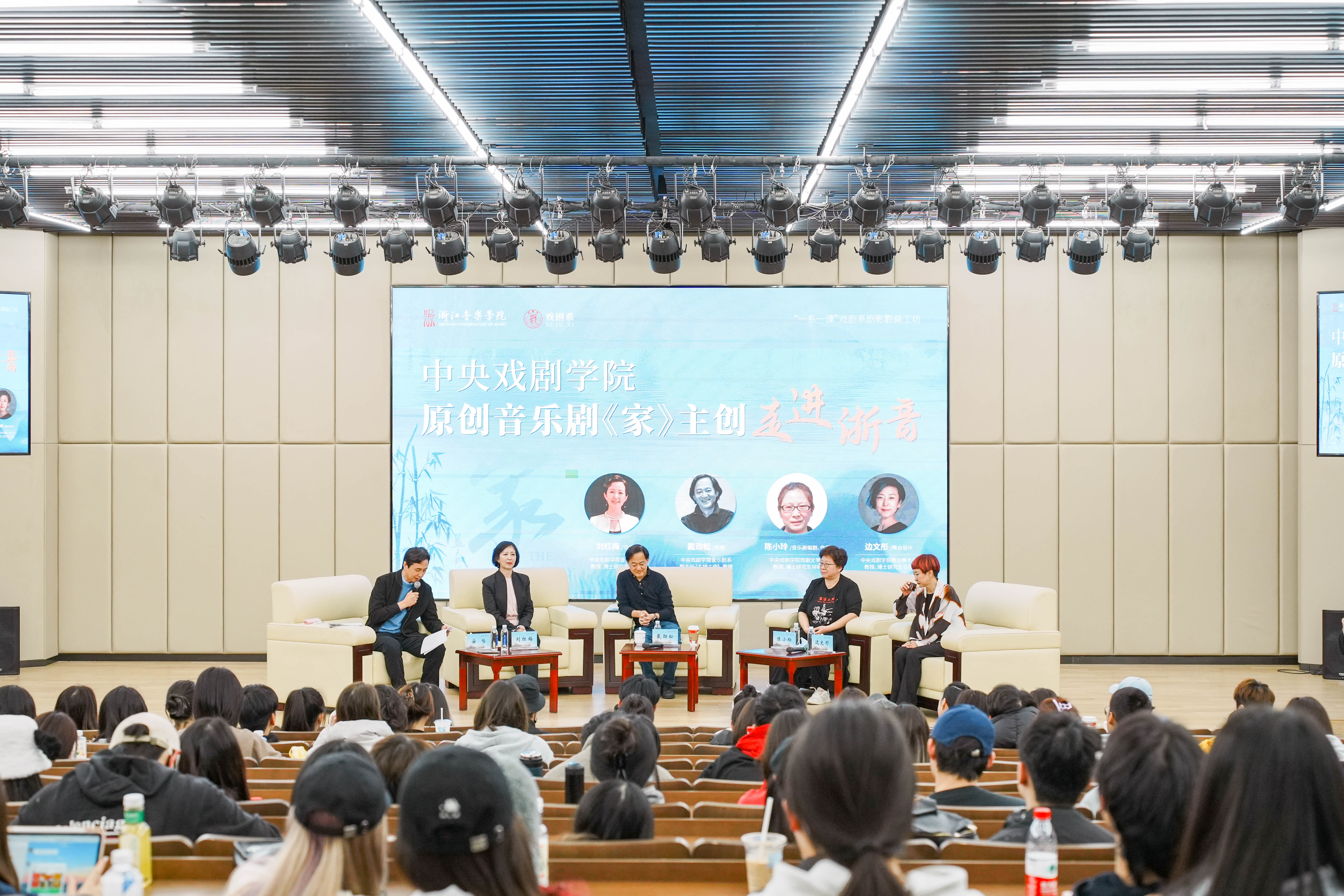 第十八屆中國戲劇節(jié)在杭州舉辦,中央戲劇學(xué)院原創(chuàng)音樂劇《家》在浙音大劇院演出,為幫助同學(xué)們更為深入地了解《家》這部原創(chuàng)音樂劇,戲劇系邀請該劇主創(chuàng):中央戲劇學(xué)院音樂劇系教授、博士研究導(dǎo)師劉紅梅教授;作曲:中央戲劇學(xué)院音樂劇系主任、碩士研究生導(dǎo)師戴勁松教授;編劇、作詞:中央戲劇學(xué)院戲劇文學(xué)系教授、博士研究生導(dǎo)師陳小玲教授;舞臺設(shè)計:中央戲劇學(xué)院舞臺美術(shù)系教授、博士研究生導(dǎo)師邊文彤教授;主演:鄭欣聞笛副教授,金圣權(quán)、田依凡老師一行七人到場,戲劇系音樂劇專業(yè)與影視表演專業(yè)的百余名同學(xué)們與部分老師參加此次活動。
