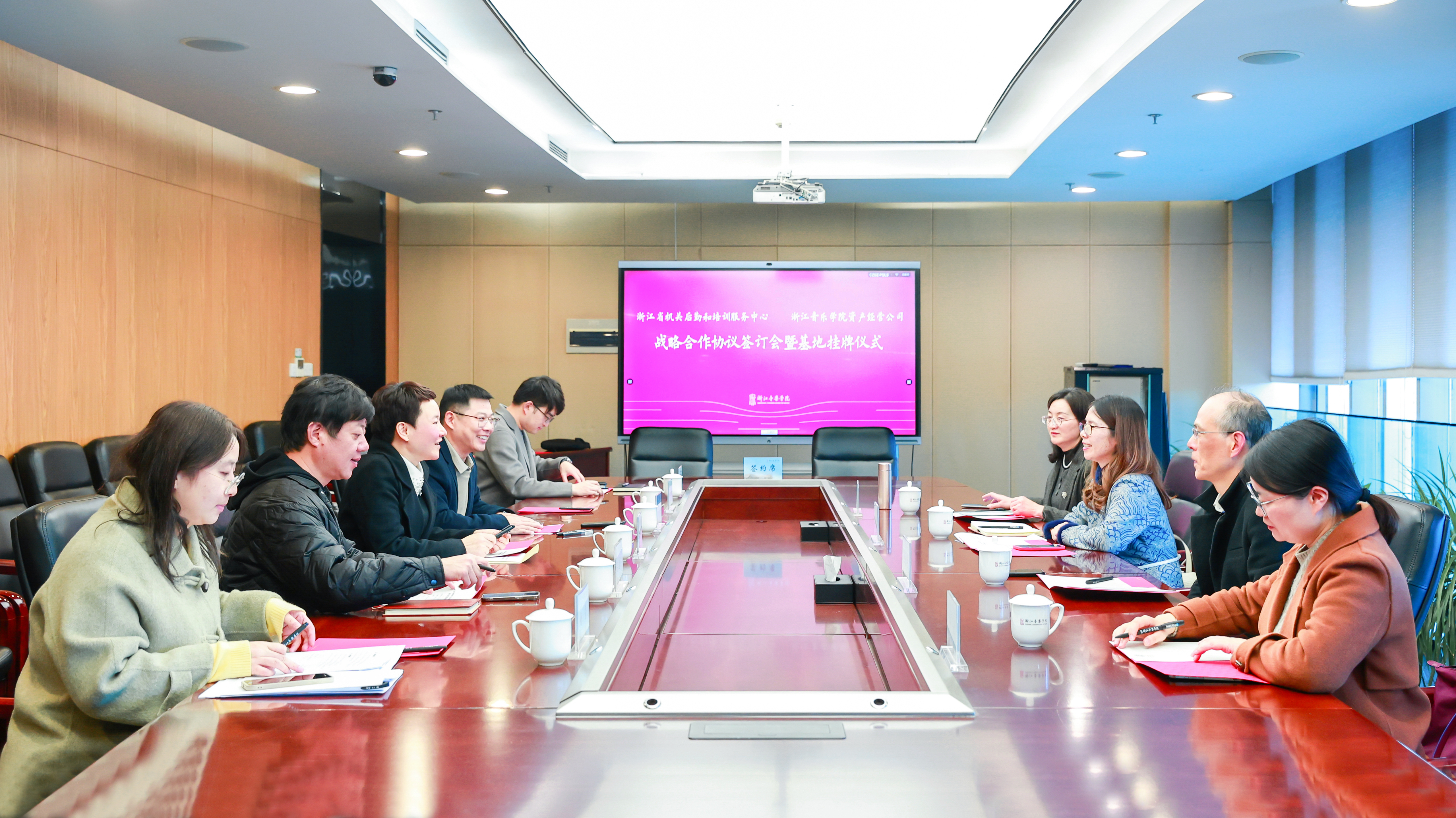12月7日下午,浙江音樂學(xué)院資產(chǎn)經(jīng)營(yíng)公司、浙江省機(jī)關(guān)后勤和培訓(xùn)服務(wù)中心戰(zhàn)略合作協(xié)議簽訂會(huì)暨基地掛牌儀式在學(xué)院舉行。浙江音樂學(xué)院副院長(zhǎng)、黨委委員奚麗萍,資產(chǎn)經(jīng)營(yíng)公司負(fù)責(zé)人,浙江省機(jī)關(guān)后勤和培訓(xùn)服務(wù)中心黨委書記、主任胡亞微,副書記、副主任張赤宇,副主任黃彩花,以及雙方相關(guān)部門負(fù)責(zé)人出席儀式。