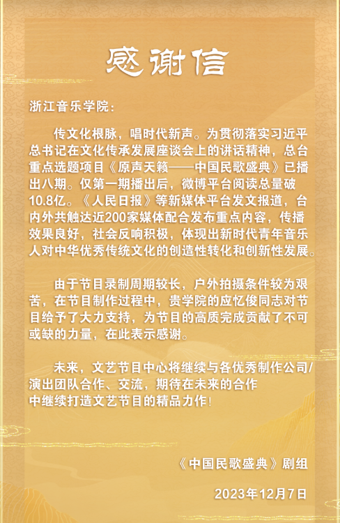 近日,央視總臺(tái)《中國(guó)民歌盛典》劇組向?qū)W校發(fā)來感謝信,感謝學(xué)院及聲樂歌劇系21級(jí)研究生應(yīng)憶俊對(duì)節(jié)目給予的大力支持。