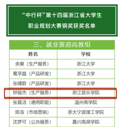 近日,浙江省大學生創(chuàng)新創(chuàng)業(yè)大賽組委會公布第十四屆浙江省大學生職業(yè)規(guī)劃大賽獲獎名單,音樂工程系學生鐘駿杰獲得“就業(yè)賽道高教組”銅獎。