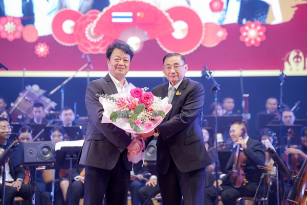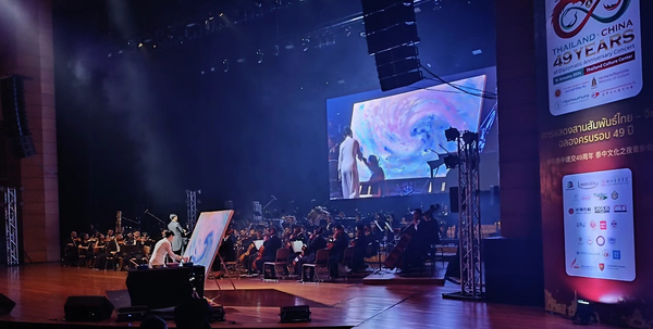 音樂會上,李躒演奏了由著名作曲家王丹紅作曲的琵琶協(xié)奏曲《云想花想》,少將納榮指揮泰國皇家海軍交響樂團協(xié)奏;李秋竹表演中國古典舞《飛天》,與大屏幕展示的浙音學(xué)子音樂-繪畫作品相得益彰、靜動有致;交響樂團弦樂隊首演了沈納藺為弦樂隊而作的《下四川》,由畫家張曉麗現(xiàn)場創(chuàng)作音樂-繪畫,該同名畫作贈予泰國文化部收藏。演出結(jié)束后,中泰方嘉賓上臺向?qū)W院教師等表演者致謝,并互致新春祝福,祝愿兩國未來更加美好、穩(wěn)定、繁榮。