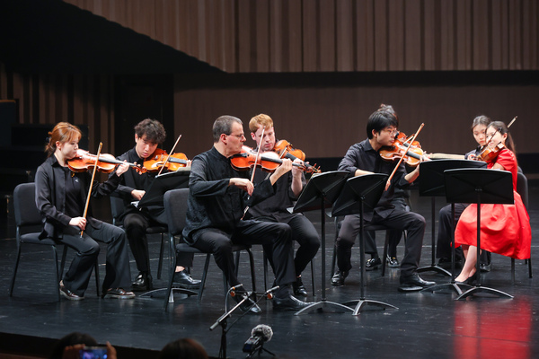 此次交流包括音樂會和大師班。音樂會以“源自海菲茲的傳承”為主題,突出庫爾曼作為著名小提琴演奏家海菲茲的關門弟子所傳承的演繹風格,并帶來包括埃爾加《e小調小夜曲》、維瓦爾第的《四季》、巴赫的《d小調雙小提琴協(xié)奏曲》以及門德爾松《降E大調八重奏》在內的四部經典作品。其中,在對埃爾加《e小調小夜曲》(Op.20,第一樂章)的演繹中,由庫爾曼領奏,ZHKD弦樂團和室內樂學院弦樂組學生同臺演繹。盡管彼此之間也是首次合作,但面對音樂,大家所表現(xiàn)出的積極配合以及對音樂共同的理解,成就了“以樂匯友”的美好畫面,憑借相互傾聽與音樂溝通建立樂句間的平衡,以達到整體音樂效果的完美呈現(xiàn),并以此獲得臺下聽眾的高度評價。
