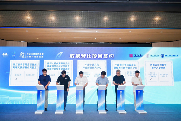 7月4日,“加快‘環(huán)之江文化創(chuàng)新圈’建設工作推進會暨成果轉化項目簽約儀式”在西湖區(qū)藝創(chuàng)小鎮(zhèn)舉行。學院與中國美術學院、國科大杭州高等研究院、藝創(chuàng)小鎮(zhèn)、轉塘街道發(fā)揮“三校一鎮(zhèn)一街”資源優(yōu)勢,共同打造生產、生態(tài)、生活“三生融合”的文化創(chuàng)新集成和產業(yè)培育孵化平臺。