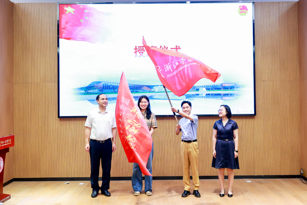 最后,在激昂的樂聲中,校黨委副書記王均寅,校黨委委員、宣傳部長(zhǎng)施瑩,向2024年“文藝輕騎兵”暑期社會(huì)實(shí)踐團(tuán)代表授旗,旗幟象征責(zé)任與使命的傳遞,浙音學(xué)子以大學(xué)為依托,以社會(huì)為舞臺(tái),接觸社會(huì)、了解社會(huì)、服務(wù)社會(huì),從中接受教育、培養(yǎng)綜合素質(zhì),讓青春為中國(guó)式現(xiàn)代化挺膺擔(dān)當(dāng)。