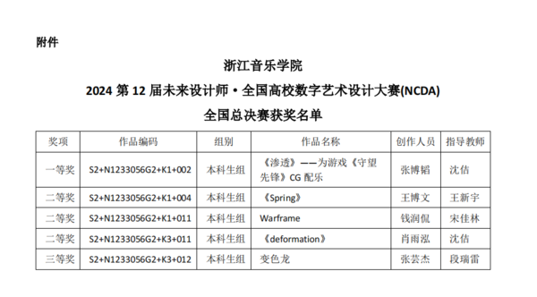 近日,第12屆未來設(shè)計師•全國高校數(shù)字藝術(shù)設(shè)計大賽全國總決賽落下帷幕,音樂工程系學(xué)子表現(xiàn)突出,參賽的五部參賽作品全部獲得獎項。其中,音樂設(shè)計與制作211班-張博韜作品《滲透——為游戲<守望先鋒>CG配樂》(指導(dǎo)老師:沈佶)榮獲一等獎,音樂設(shè)計與制作211班-錢潤侃作品《Warframe》(指導(dǎo)老師:宋佳林)、音樂設(shè)計與制作211班-王博文作品《Spring》(指導(dǎo)老師:王新宇)、音樂設(shè)計與制作211班-肖雨泓作品《Deformation》(指導(dǎo)老師:沈佶)獲得二等獎,音樂設(shè)計與制作221班-張蕓杰作品 《變色龍》(指導(dǎo)老師:段瑞雷)獲得三等獎。