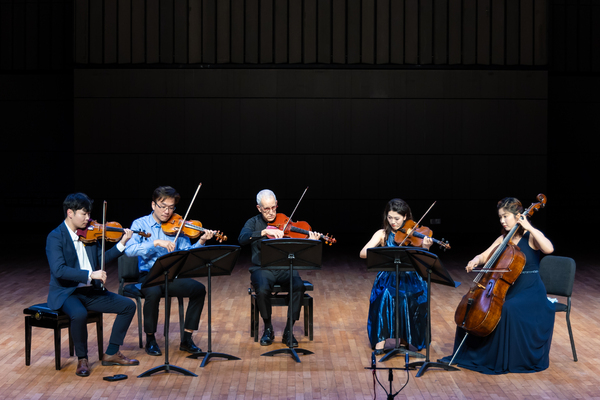 音樂會的下半場,特南博姆與“杭州四重奏”聯(lián)合呈現(xiàn)了德沃夏克的《降E大調(diào)第三弦樂五重奏》。在處理音樂的和聲、織體以及聲部層次方面,各主題在保持自身特性的同時,巧妙地融合、構建了一個有序且層次清晰的音樂景象。藝術家們對作品中的不同變奏技巧的精準運用,不僅展現(xiàn)了他們各自卓越的演奏技巧,也深刻體現(xiàn)了對音樂深意的洞察力和獨到見解。他們的演奏不僅準確捕捉到了德沃夏克音樂中的豐富情感色調(diào),還細膩地呈現(xiàn)了室內(nèi)樂主題的微妙轉變,使演繹既充滿活力又不失細膩與精致。