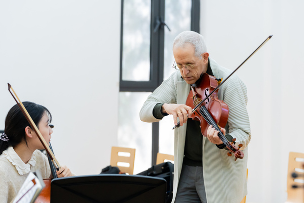 在大師班上,特南博姆先生在對樂曲剖析的過程中,始終立足于對音樂結構、主題發(fā)展及整體布局的深刻洞察,其分析構建在嚴謹?shù)囊魳防碚撝稀K哂忻翡J的洞察力,能夠精確把握作曲家的創(chuàng)作初衷與內(nèi)在動因。在探討音樂作品的內(nèi)涵時,來自管弦系與室內(nèi)樂學院的優(yōu)秀學子再現(xiàn)了巴赫、莫扎特、勃拉姆斯和欣德米特等作曲大師的中提琴佳構,并以其獨特的視角傳達作品中的情感深度和哲學意蘊。在此過程中,特南博姆著重強調(diào)了音樂結構分析的精確性,以及對弓法和力度選擇的精細考量。他的演奏哲學不僅在于追求音色的透明和旋律的連貫,更在于如何在豐富的音響層次中發(fā)掘音樂的核心動力。即使是面對諸如帕格尼尼與欣德米特的技巧巔峰,特南博姆依然堅守音樂傳達的核心,深刻挖掘演奏的多維復雜性和創(chuàng)造性。