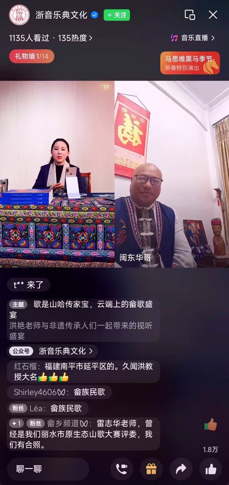 1月23日,“云端上的畬歌盛宴,歌是山哈傳家寶”公益直播活動成功舉辦。直播通過“一根網(wǎng)線”連接起畬族音樂代表性傳承人、研究者、愛好者及廣大觀眾,共同在線上探討文化傳承與發(fā)展,不僅有效融合了高校資源與地方非遺文化,還充分彰顯了畬族音樂的藝術(shù)價值,為非物質(zhì)文化遺產(chǎn)的保護(hù)與創(chuàng)新發(fā)展注入了新的活力。本次活動由樂典文化主辦,音樂學(xué)系教授、畬族音樂文化研究中心主任洪艷擔(dān)任主播。