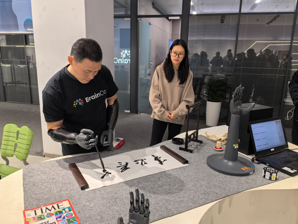 在強(qiáng)腦科技公司展廳,師生們近距離觀摩了多款創(chuàng)新產(chǎn)品,如創(chuàng)新產(chǎn)品智能仿生手,通過肌電信號、神經(jīng)電信號捕捉和機(jī)器學(xué)習(xí)算法,使義肢能夠精準(zhǔn)識別用戶動作意圖,完成一系列復(fù)雜操作?,F(xiàn)場兩位體驗(yàn)官用智能仿生手分別完成了寫書法、彈琴等高難度動作,令師生驚嘆不已。師生還體驗(yàn)了基于腦電波監(jiān)測的助眠設(shè)備腦機(jī)智能安睡儀,和通過實(shí)時數(shù)據(jù)反饋直觀感受自身冥想狀態(tài)變化的正念舒壓系統(tǒng)。此外,師生還了解了一款虛擬現(xiàn)實(shí)教學(xué)軟件,該軟件結(jié)合VR技術(shù),通過模擬社交場景幫助孤獨(dú)癥兒童進(jìn)行行為訓(xùn)練,展現(xiàn)了科技在孤獨(dú)癥康復(fù)中的潛力。技術(shù)人員還為師生詳細(xì)解析了非侵入式腦機(jī)接口的核心原理,師生們也積極參與產(chǎn)品技術(shù)的交流與體驗(yàn)中。