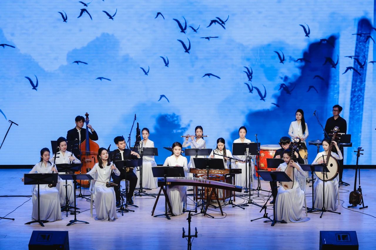 隨后,樂團(tuán)依次演奏了《詩雨江南》、《無錫景》、《楊柳青》、《三五七》等江南經(jīng)典曲目,仿佛讓人置身于煙雨朦朧的江南水鄉(xiāng),旋律似潺潺溪流,淌入人心。