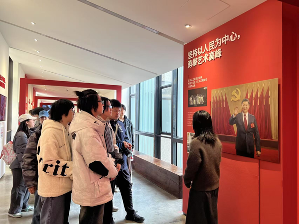 中國美術(shù)學(xué)院馬克思主義學(xué)院青年教師陳珍介紹了“國美黨建之路——黨建文化長廊”,帶領(lǐng)大家領(lǐng)略了中國美術(shù)學(xué)院扎根中國大地辦教育、藝術(shù)家們肩負使命“為藝術(shù)而戰(zhàn)”的歷程,黨建文化長廊鮮明的紅色基因和藝術(shù)特色,引發(fā)了師生們深切的情感共鳴。陳珍老還導(dǎo)學(xué)了“中國共產(chǎn)黨人精神譜系”美術(shù)作品展,《啟航——中國共產(chǎn)黨成立》《楊家?guī)X初雪——延安文藝座談會》等藝術(shù)精品生動展現(xiàn)了建黨百年來的重大歷史性事件,深刻詮釋了“中國共產(chǎn)黨人精神譜系”的時代內(nèi)涵,讓同學(xué)們直觀感受到巨大感召力。